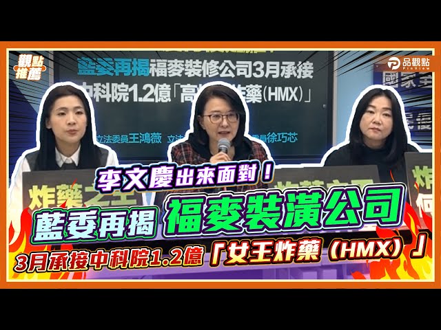 國民黨立委王鴻薇、徐巧芯、馬文君今(12)日召開記者會,繼日前揭露福麥國際室內裝修公司得標國防部5.9億元RDX軍售案後,再度爆料該公司今年3月12日也拿下中科院編號YR13Z07P、標案金額達1.2億元的HMX炸藥採購案。立委質疑,一家登記在旅館、連招牌都沒有的裝潢公司,半年內竟能接連得標上億國防標案,背後是否有人護航,要求相關單位說明清楚。
