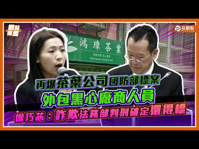 國民黨立委徐巧芯昨(17)日在立法院外交及國防委員會質詢時踢爆,海軍一項系統維護採購案,竟由一間「鴻璋茶行」得標,更離譜的是,該茶行聘用的維修人員,竟是曾涉詐欺、偽造文書遭列拒絕往來戶的「鈞威科技」前負責人黃鴻鈞,且職稱被掛為「工讀生」。徐巧芯痛批國防部對廠商資歷審核鬆散,形同讓黑名單廠商「借屍還魂」。