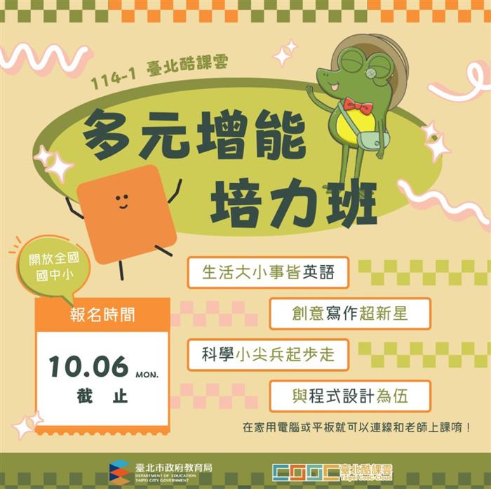 臺北市政府教育局表示,數位學習的價值不僅在於鞏固學科知識基礎,更能透過多元跨域的學習體驗開拓視野,讓學生在語文表達、科學探究與科技應用等領域全面發展,養成自主學習的能力及激發潛能。「國中小多元增能培力班」課程自114年10月15日(星期三)至114年12月28日(星期日)止,無須任何報名費用,課程名額有限,歡迎全國各縣市公私立國小、國中學生於114年10月6日(星期一)前踴躍報名參加。