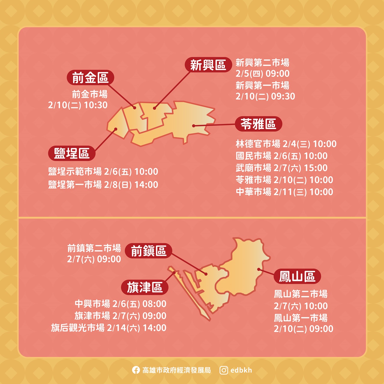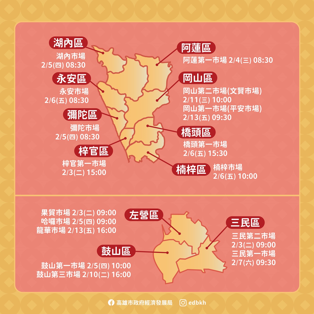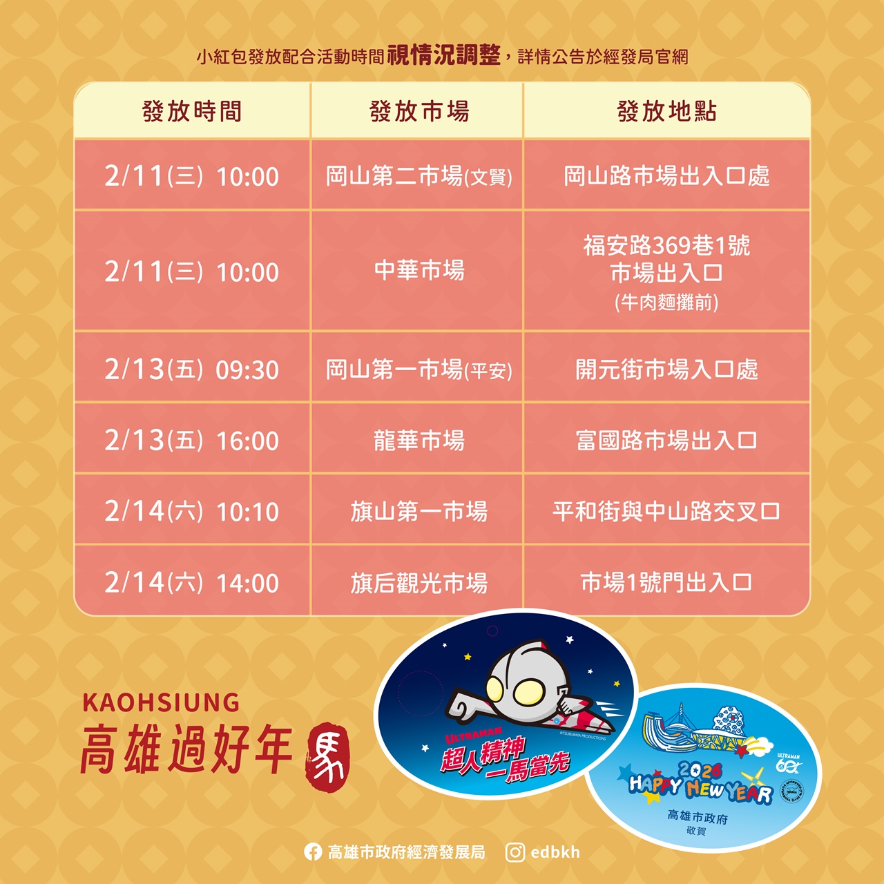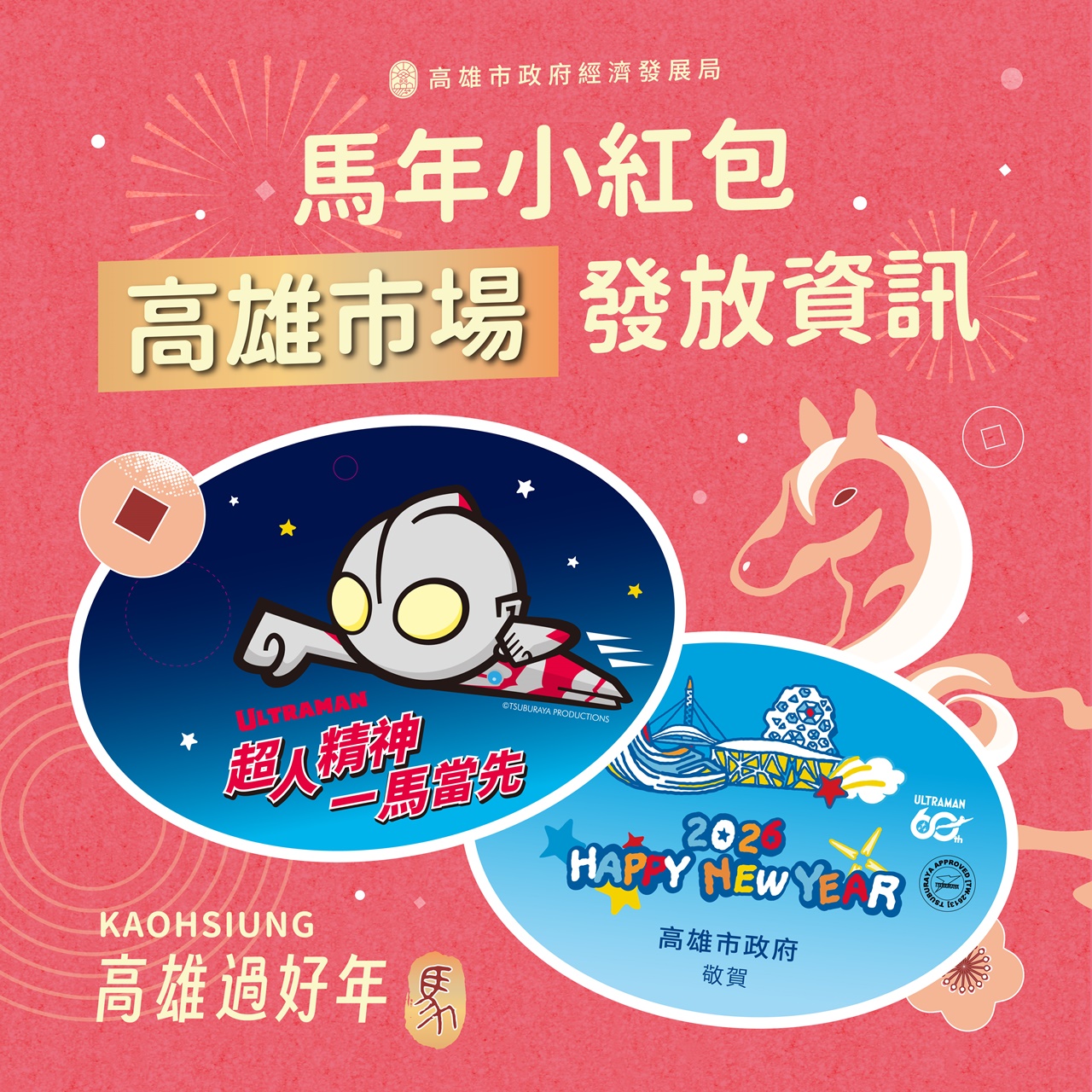 經發局說明,為迎接馬年新春,市府提供開運小紅包,將於龍華、武廟、哈囉、岡山文賢等超過30處公有市場發放。歡迎市民領紅包討吉利,期盼收到的民眾如同馬年大吉、新年行大運!詳細發放資訊請洽各公有市場自治會與經發局臉書,數量有限,發完為止。此外,春節期間商圈「高雄過好年」系列活動同步展開,共計27處商圈參與,結合市集活動、消費優惠與節慶布置,邀請全國遊客與市民朋友於春節期間走訪高雄各地特色商圈,感受濃厚年節氛圍。