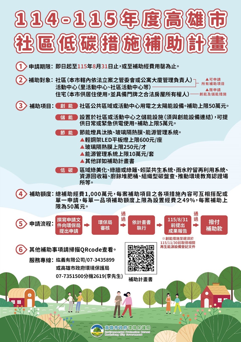為了讓社區參與減碳行動,高雄市環保局依據「高雄市淨零城市發展自治條例」,推出「114-115年度高雄市社區低碳措施補助計畫」,申請期限至今(115)年8月31日止,補助總經費共計1,000萬元,每單位最高補助50萬元,項目包含創能、儲能、節能與低碳措施等四大面向,補助比例上看49%,對象包含社區大樓(管委會)、活動中心;另外家戶部分,則可申請光電項目,比例同樣上看49%,歡迎多加利用。