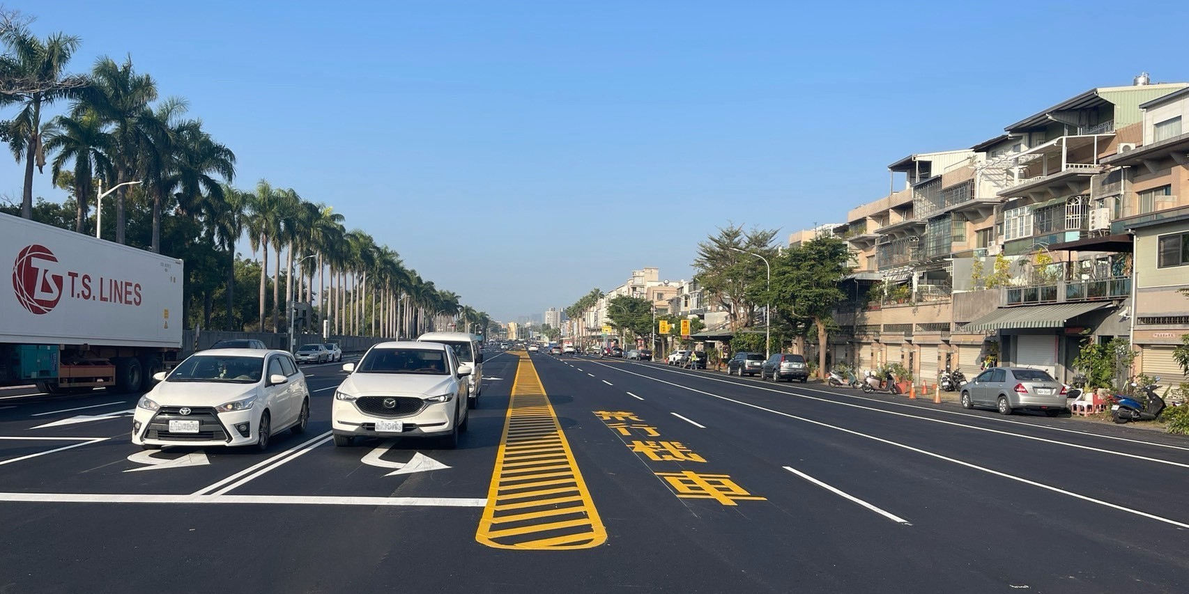 道工處說明,本次改善工程選用可有效減少碳排放的再生瀝青混凝土換新路面,且因凱旋路路幅較寬約33公尺,為兼顧各用路族群權益、保障通行安全,於施工時一併打除私設斜坡道,並配合交通局規劃,重新調整車道寬度後新增自行車道與停車彎、增設醒目的中央槽化分向線分隔車流並設置左轉附加車道,營造更貼近當地機能、友善用路人的道路空間,亦串聯周邊自行車道騎乘動線。