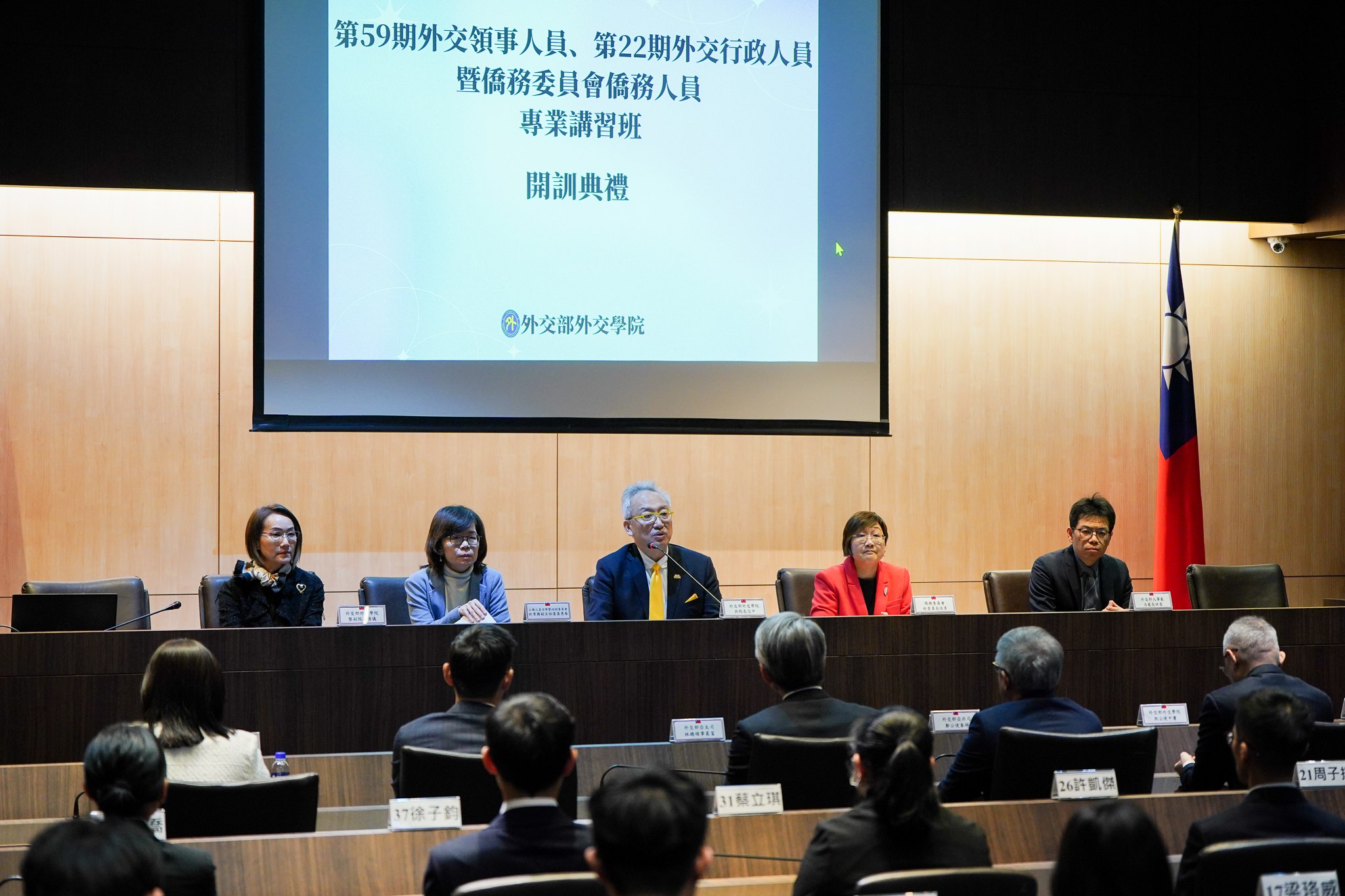「第59期外交領事人員、第22期外交行政人員暨僑務委員會僑務人員專業講習班」於今(2026)年1月12日在外交學院舉行開訓典禮,由外交部政務次長兼外交學院院長吳志中代表外交部長林佳龍主持,考試院公務人員保障暨培訓委員會常務副主任委員許秀春及僑務委員會委員長徐佳青也應邀觀禮。