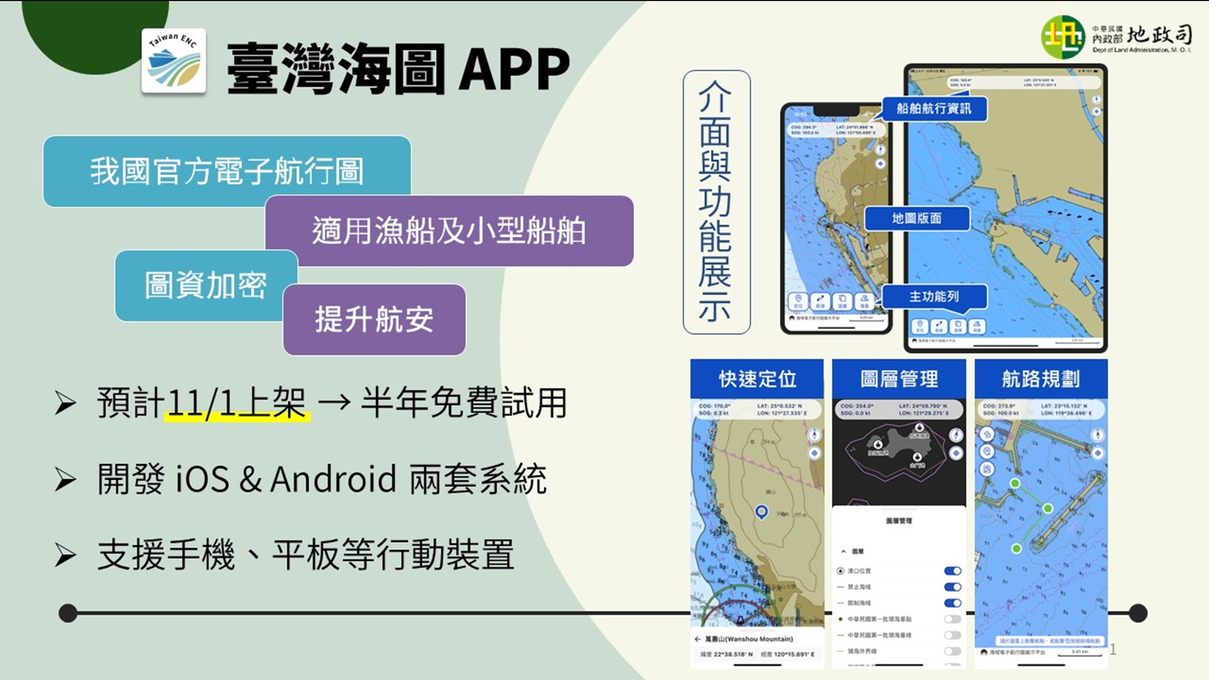 內政部說明,「臺灣海圖APP」結合全球衛星定位技術,將海圖、海象、潮汐等相關資訊導入行動載具,在網路覆蓋範圍內,可讀取即時海事資訊,在離線時亦可事先下載圖資使用,不僅解決傳統上僅依船長經驗或非官方導航圖資之風險問題,更滿足國內小型船舶、漁船或遊艇等所需參考圖資需求。