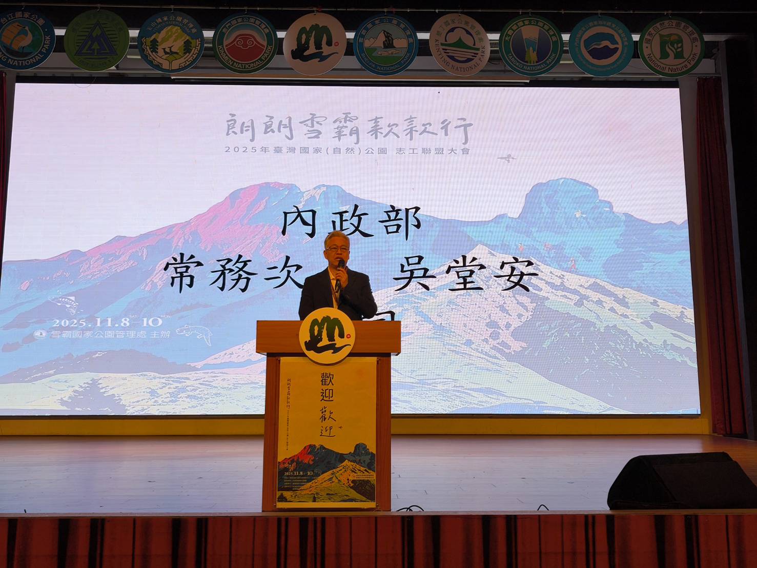 國家公園署雪霸國家公園管理處今(8)日於汶水園區舉辦為期3天的「朗朗雪霸款款行」2025年臺灣國家(自然)公園志工聯盟大會活動。內政部吳堂安常務次長出席開幕典禮致詞表示,感謝全臺2,415位志工長期投入國家(自然)公園服務,每年累計時數高達30萬小時,與政府共同守護臺灣珍貴的自然資產,並親自頒發「志工楷模」表彰17位傑出志工夥伴,肯定其在生態保護、環境教育、步道巡護及解說推廣上的專業貢獻。