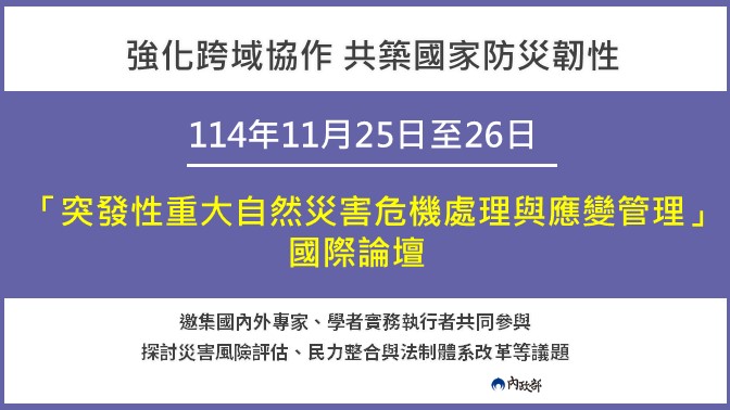 內政部11/25-26舉辦重大自然災害應變國際論壇 強化跨域協作 共築國家防災韌性
