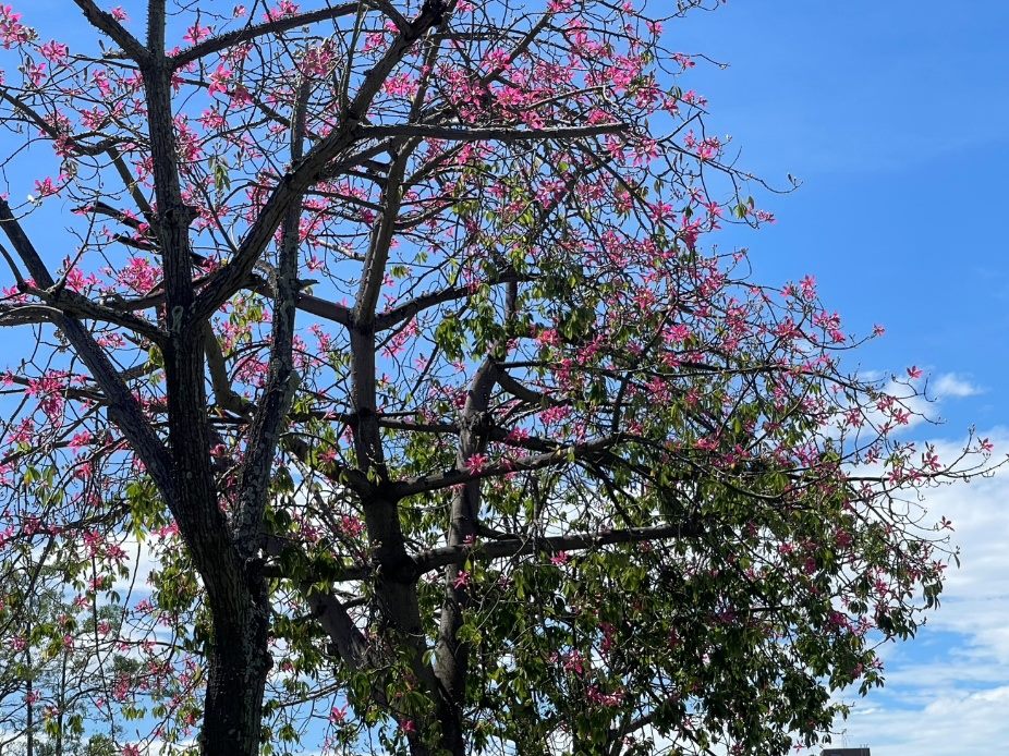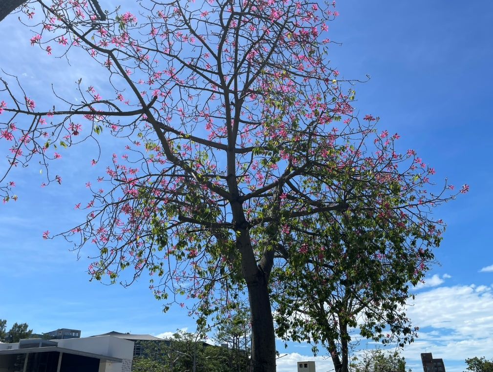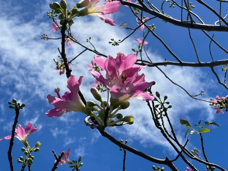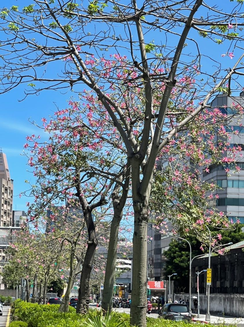 公園處表示,美人樹是木棉科美人櫻屬的落葉性大喬木,株高可達20公尺,樹幹基部膨大有刺,樹幹上的刺磨損後便不會再生;樹葉互生呈掌狀,有小葉5-7枚;花瓣為裂辦五瓣,呈現淡粉色至洋紅色,近花蕊處呈現淡淡牛奶白;每逢開花時,藍天白雲下綠葉點綴粉紅花瓣,完勝一幅美麗的風景畫,令人留連忘返,美不勝收。