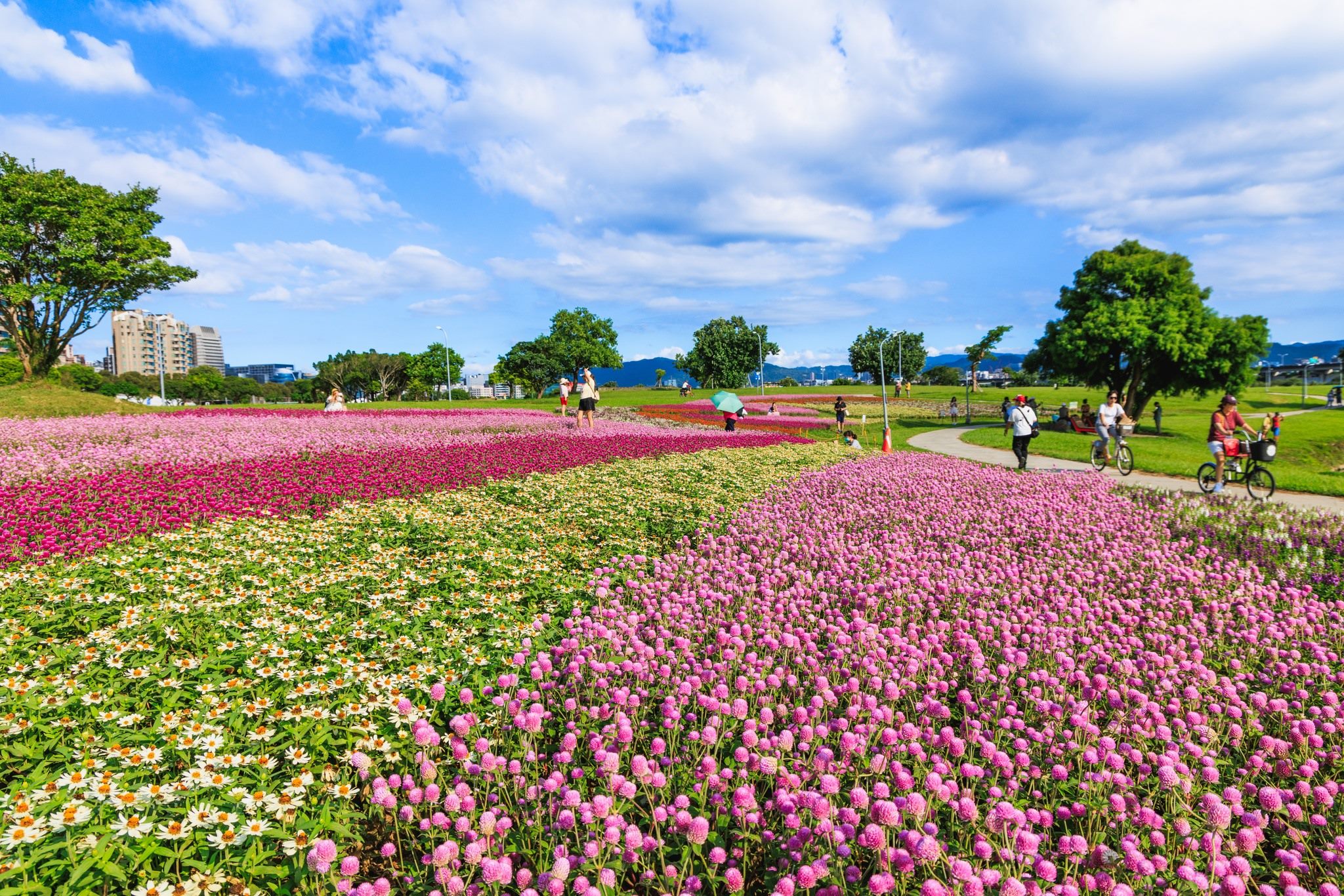 中秋連假好去處,就在北市美堤河濱公園! 自然親水灣旁,北市水利處營造了「野花系五彩繽紛花毯」,尤其是雙色的圓仔花毯現正美麗盛開中,讓悠閒恬靜的河濱公園添加許多活潑的氣氛,即日起至114年10月底為花海最佳觀賞期。