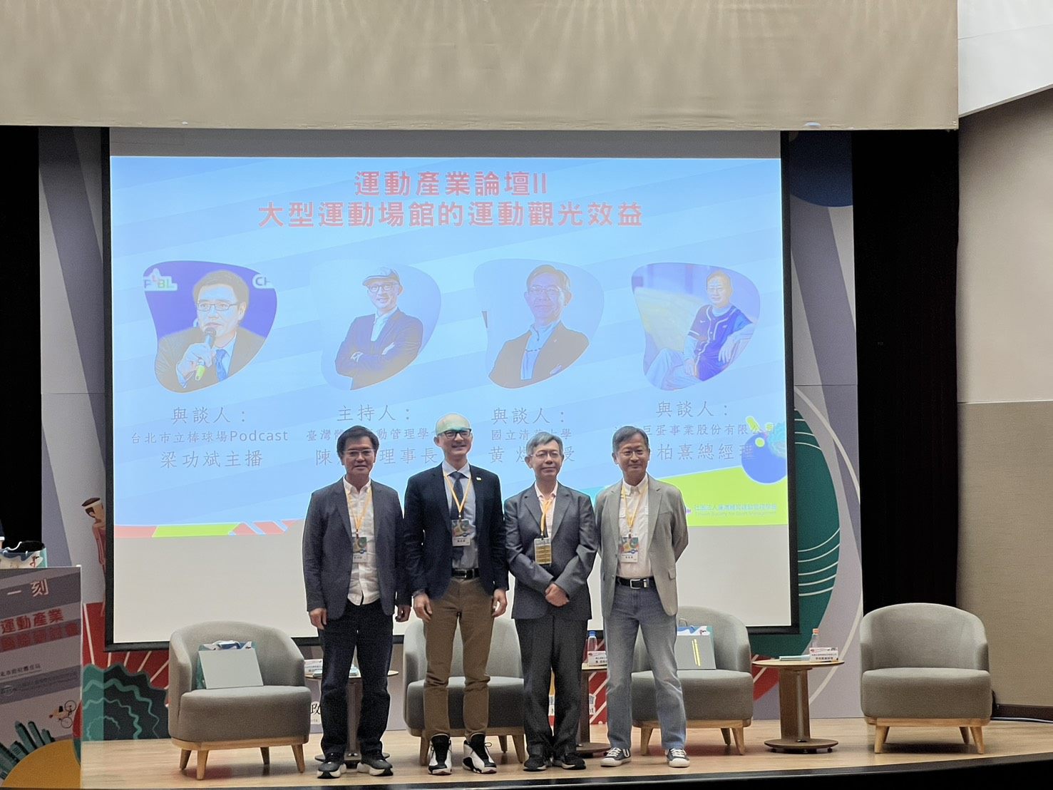 隨著臺北大巨蛋成為2024年WBSC世界棒球12強賽場地,並成功於2025年雙北世界壯年運動會擔任開幕場館及棒球賽事決賽主場,本次研討會第二場運動產業論壇以「大型運動場館與運動觀光」為核心,由臺灣體育運動管理學會陳成業理事長擔任主持人,邀集國立清華大學黃煜教授、遠雄巨蛋事業股份有限公司李柏熹總經理及台北市立棒球場Podcast梁功斌主播與會,探討場館在城市發展中的關鍵角色,分享如何透過場館多元化運用,促進觀光與運動經濟相互加乘,創造周邊商機,提升城市國際能見度,展現運動產業作為城市經濟引擎的潛力。