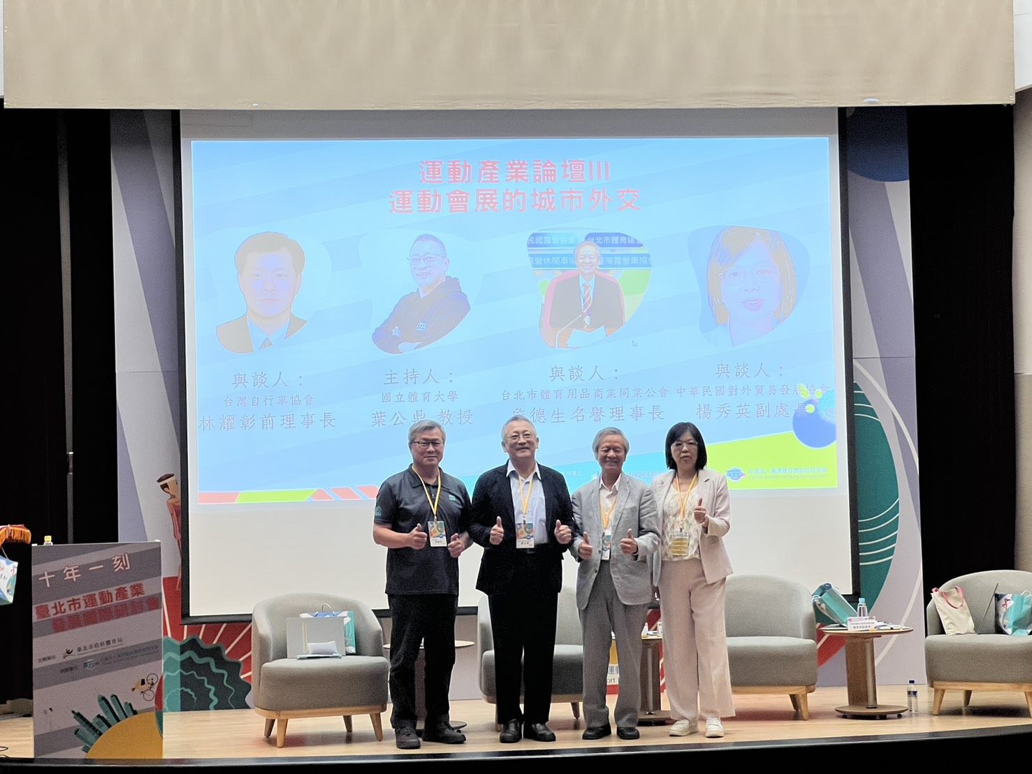 本次研討會選址交通便利的台北國際會議中心,鄰近我國會展重鎮世貿中心,因此特別將「運動會展與城市外交」納入討論範疇,由國立體育大學葉公鼎教授主持,邀請中華民國對外貿易發展協會展覽業務處楊秀英副處長、台北市體育用品商業同業公會詹德生名譽理事長及台灣自行車協會林耀彰前理事長,共同探討如何透過舉辦國際運動會展展現城市軟實力與多元文化,提升國際能見度,並帶動觀光與經濟發展,實現體育與城市共榮的願景。
