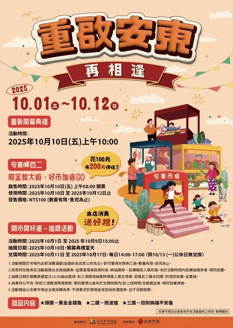 安東市場歷經去年火災後,經市場處修復完成,目前已由攤商進駐整理攤位及試營運,為展現新整理之市場風貌,預計於114年10月10日正式開幕,由市府局處長官、地方民代與攤商齊聚,當日將舉辦盛大的開幕典禮,象徵市場重生,也誠摯邀請臺北市民再次走入市場,感受久違的熱鬧氛圍。