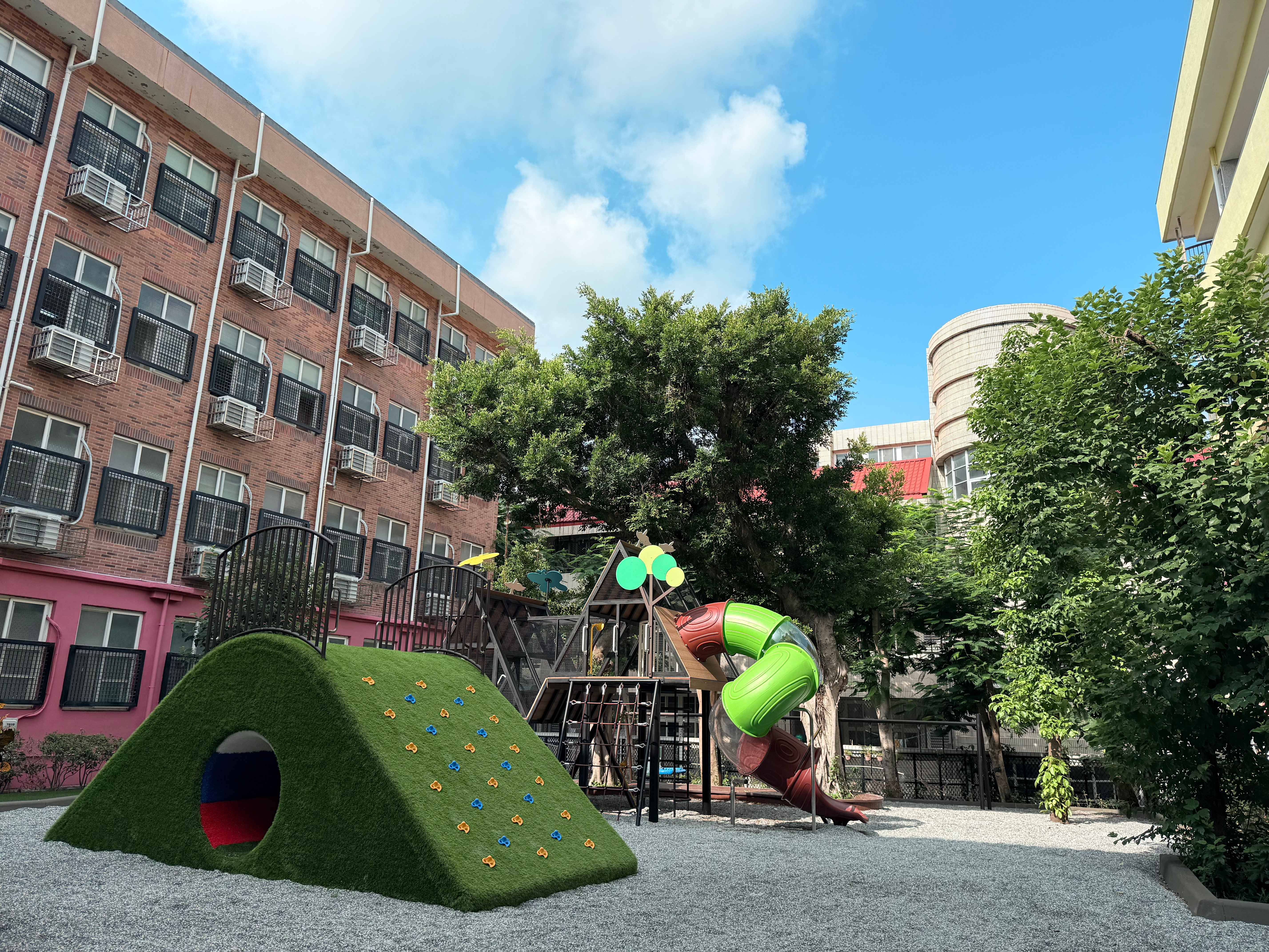 這座「嬉願遊戲場」規畫時邀請全校的班級代表討論,共同描繪期待的遊戲場,當時還有學生自己畫圖,提出建議。在教育局的支持下,以細小的圓角礫石做為主要鋪面,排水良好且更環保。最終規劃出五大核心區域,讓不同特質、不同需求的孩子們,都能找到屬於自己的舞台,並在互動中學會尊重與同理。