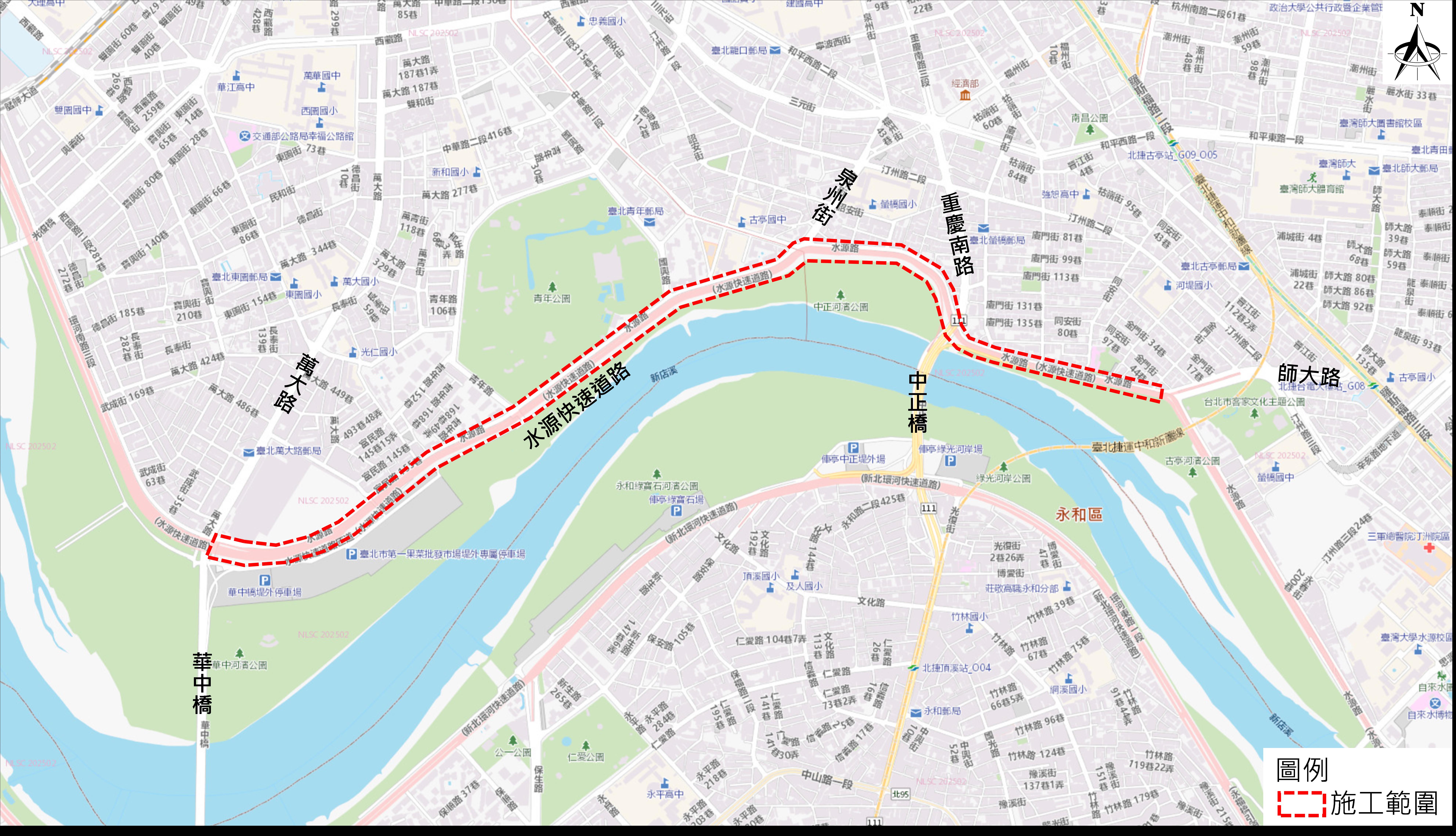 考量水源快速道路旁人行道因使用情形不高,長期閒置空間易滋生雜草,影響市容景觀,臺北市政府工務局新建工程處辦理的水源快速道路(華中橋至師大路)將於114年10月8日起進行人行道拆除工程,預計於115年4月中完成,以提升道路整體使用效能並改善行車舒適性;施工時間避開一般道路尖峰時段施工,本工程分為3階段進行施作,第1階段為華中橋至泉州街匝道路段,第2階段為泉州街匝道至中正橋往水源快速道路入口匝道路段,第3階段為中正橋往水源快速道路入口匝道至師大路匝道路段。