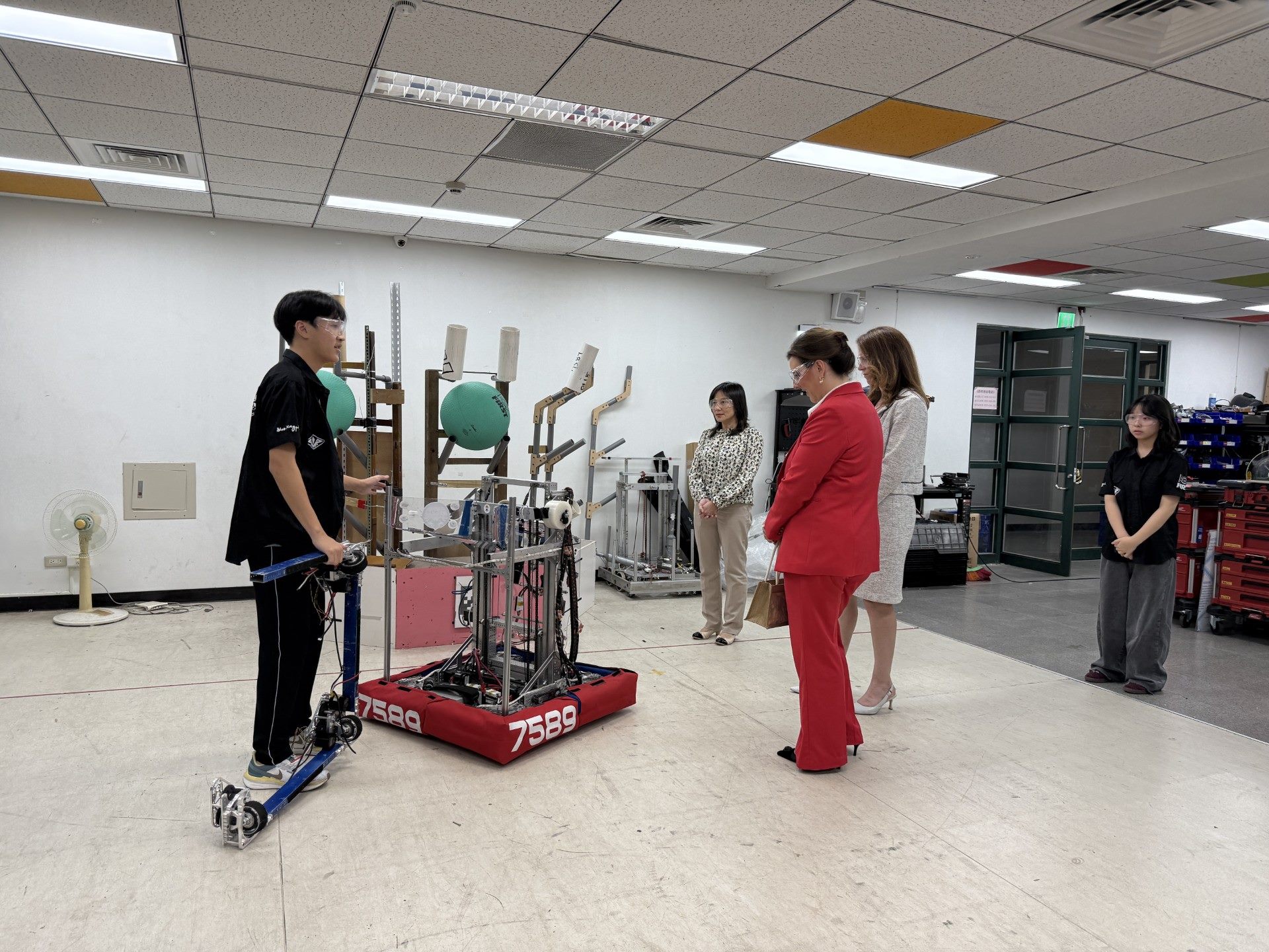 麗山高中陳汶靖校長率領行政與教學團隊熱情接待,安排學生以全英語導覽校園,介紹學校特色課程及社團活動。訪賓特別關注本校接待學生團隊—星嵐大使團的表現,讚許學生展現自信與流暢的英語溝通能力,充分體現雙語教育成果。訪賓亦參觀本校 FRC 機器人團隊,透過團隊簡報及體驗操作活動了解麗山高中如何結合STEM教育與國際競賽,培養學生跨域思維與團隊合作精神。Weaver廳長表示,麗山高中學生展現的主動學習與創新精神令人印象深刻,並表示歡迎未來學校團隊有機會造訪南卡羅萊納州,持續深化雙方教育交流。