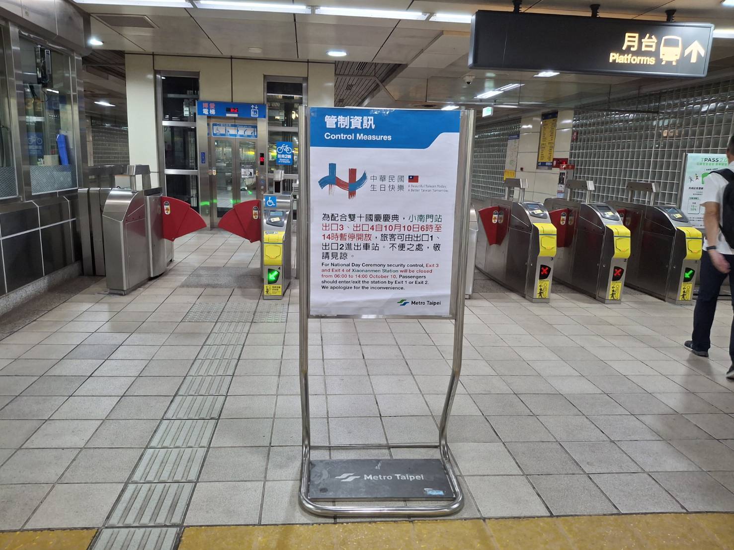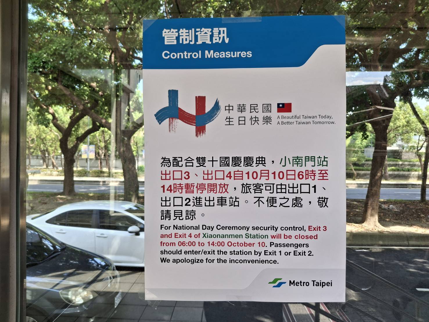 此外,10日國慶日上午6時至14時,小南門站3號與4號出口,及中正紀念堂站7號出口暫時關閉,警方將視情況提前或延後開放。