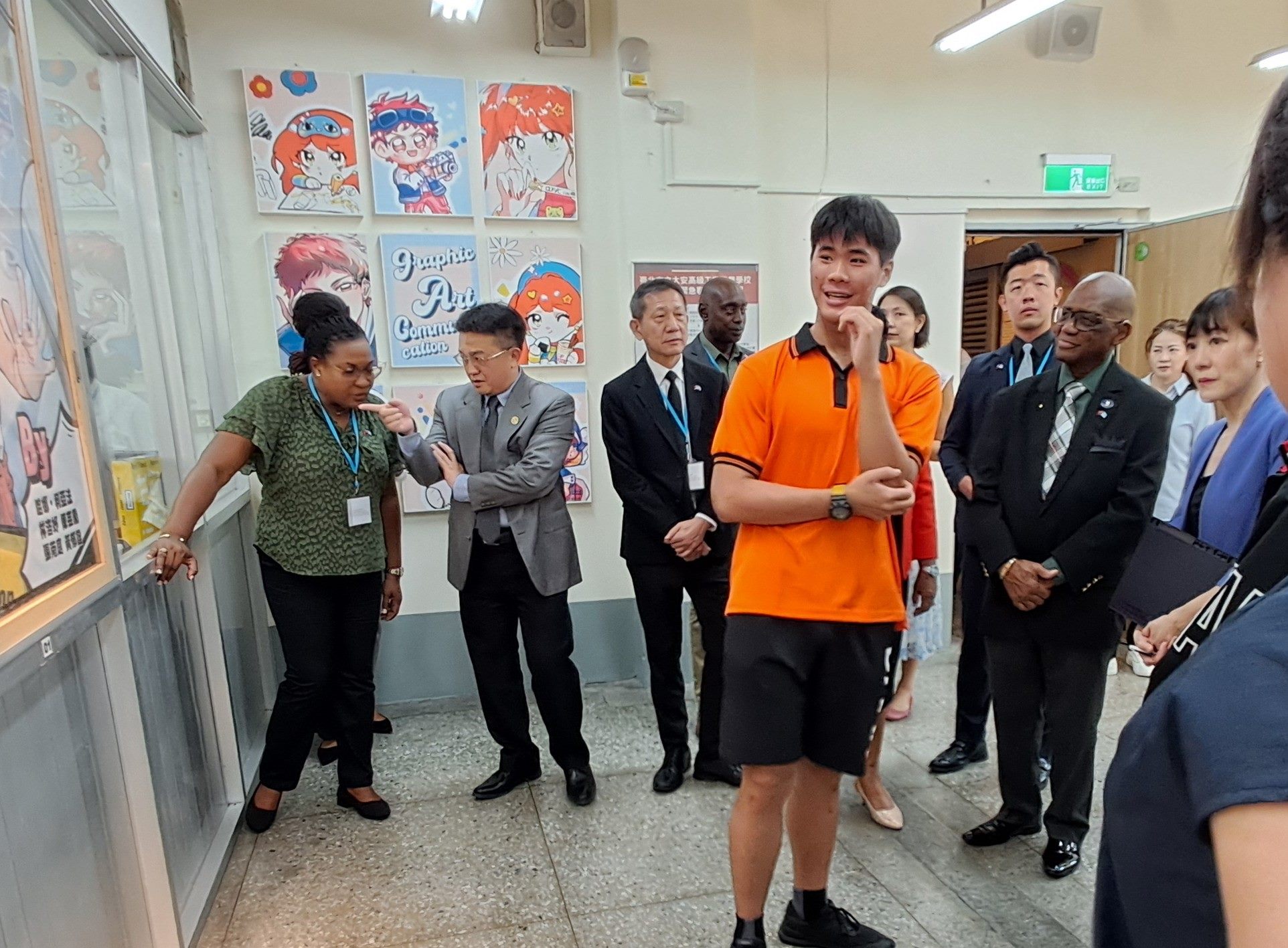 為使貴賓更深入了解臺灣技職教育的發展,特別安排簡報介紹我國技職教育制度的特色與學校辦學方向,分享臺北市推動技職教育的成果與經驗。隨後參訪團一行前往電機科與圖文傳播科,由同學以英文進行導覽與介紹。電機科同學介紹各年級學生的學習重點與作品製作過程;圖文傳播科則帶領貴賓參觀學生作品,欣賞學生在平面設計、立體創作、攝影與主題設計等領域的成果。導覽過程中,總督伉儷與學生親切互動,現場洋溢著學習與文化交流的熱情。