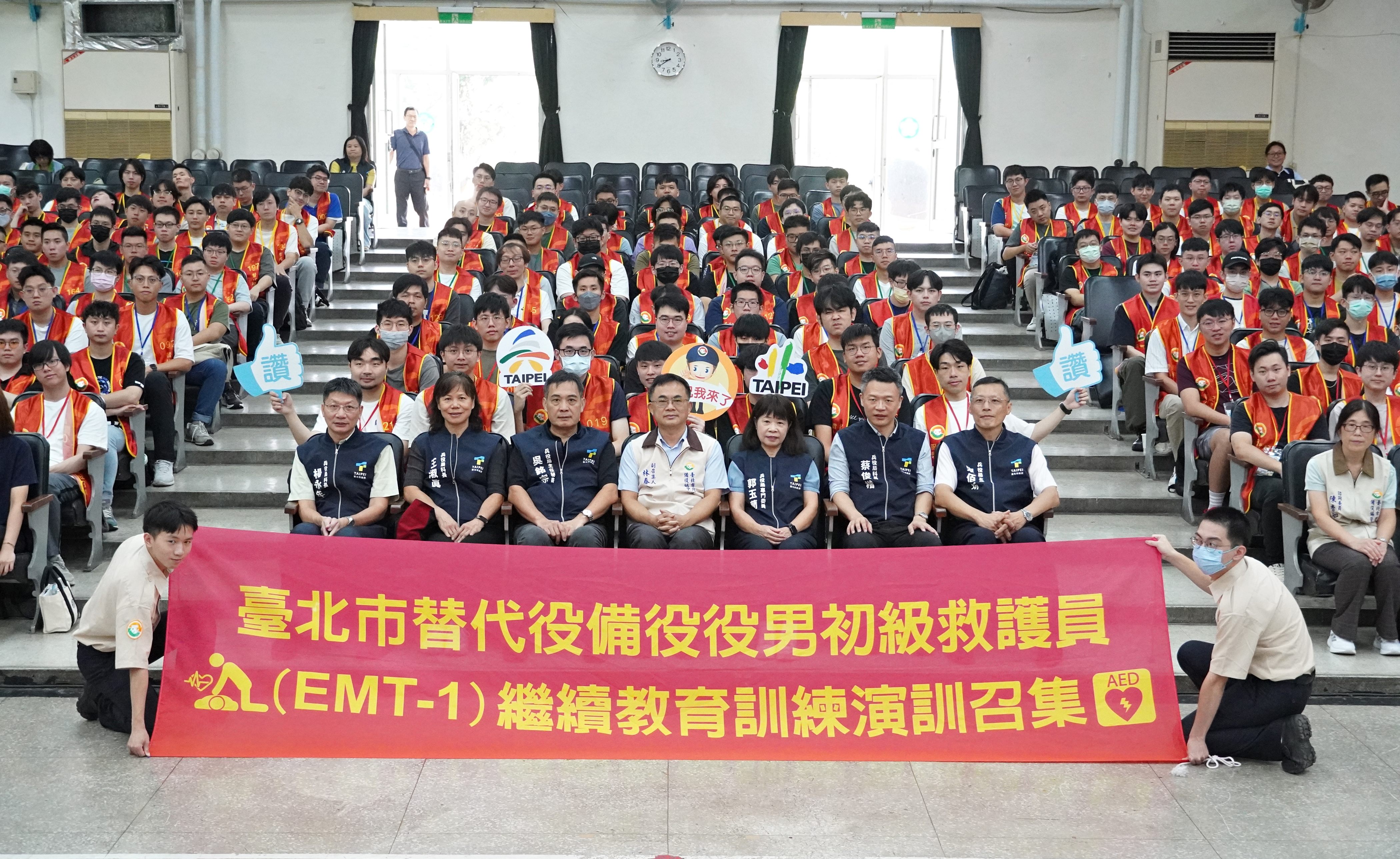 臺北市政府在10月14日至17日,假兵役局 替代役中心辦理114年下半年替代役備役役男初級救護員(EMT-1)繼續教育訓練第1梯次演訓召集,由兵役局林春來副局長代表蔣萬安市長主持開訓典禮。本次召訓課程以EMT-1初級救護複訓及全民防衛教育為核心,旨在強化市府防救災與緊急救護量能,共計有305名備役役男應訓。