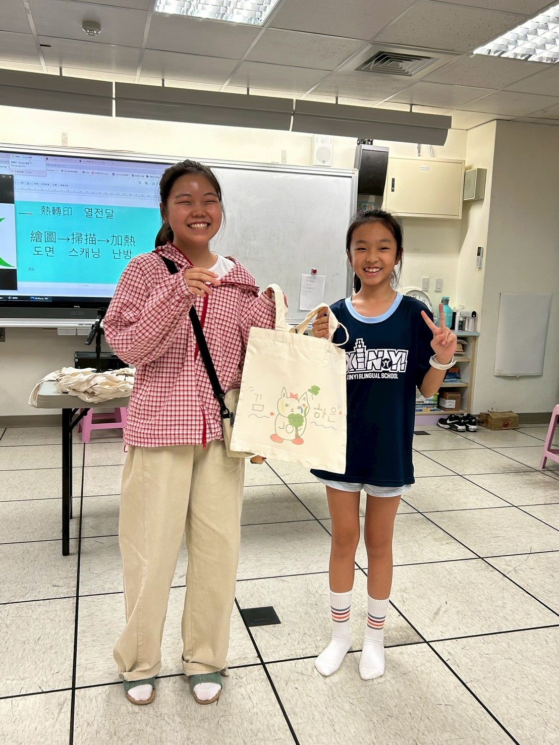 STEAM熱轉印的文化學習課程中,信義學生與韓國學伴共同設計屬於自己喜愛的圖樣,印在袋子上留念,接著在藝術課一起彩繪風箏,畫下屬於自己的臺灣回憶,一個人一手拉線,另一個協助舉高風箏,當風箏在圓形廣場中飄揚時,象徵友誼高飛,那是最真實的青春與友誼的美麗畫面。