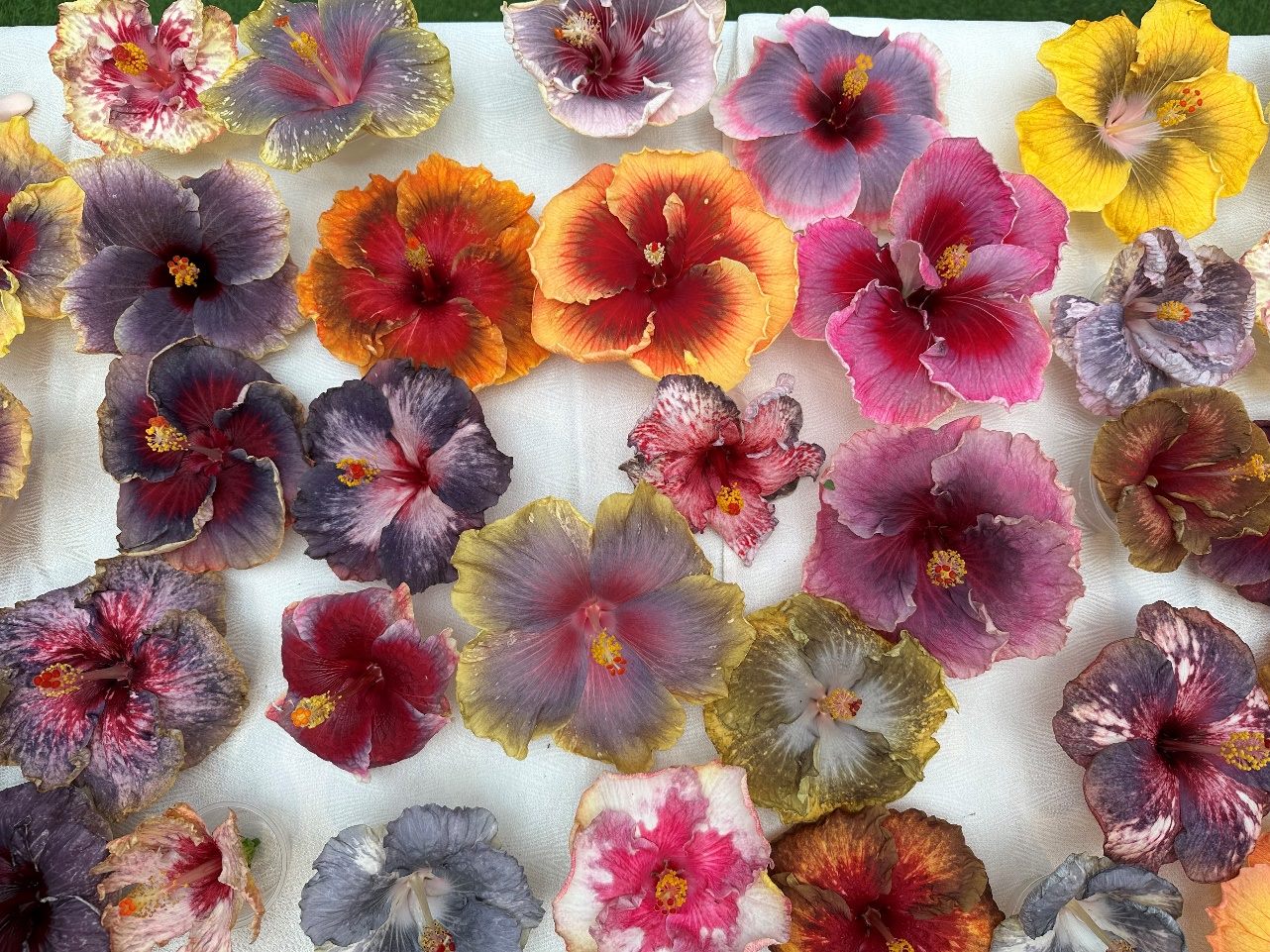 走進展館,你會忍不住懷疑——這些朱槿花是沾到顏料了嗎?一朵朵花瓣如同畫家的創作,有的渲染暈染、有的拼貼漸層、有的描邊細緻,還有如潑墨般奔放的花色變化。這些令人驚嘆的色彩,正是臺灣育種家多年努力的結晶。