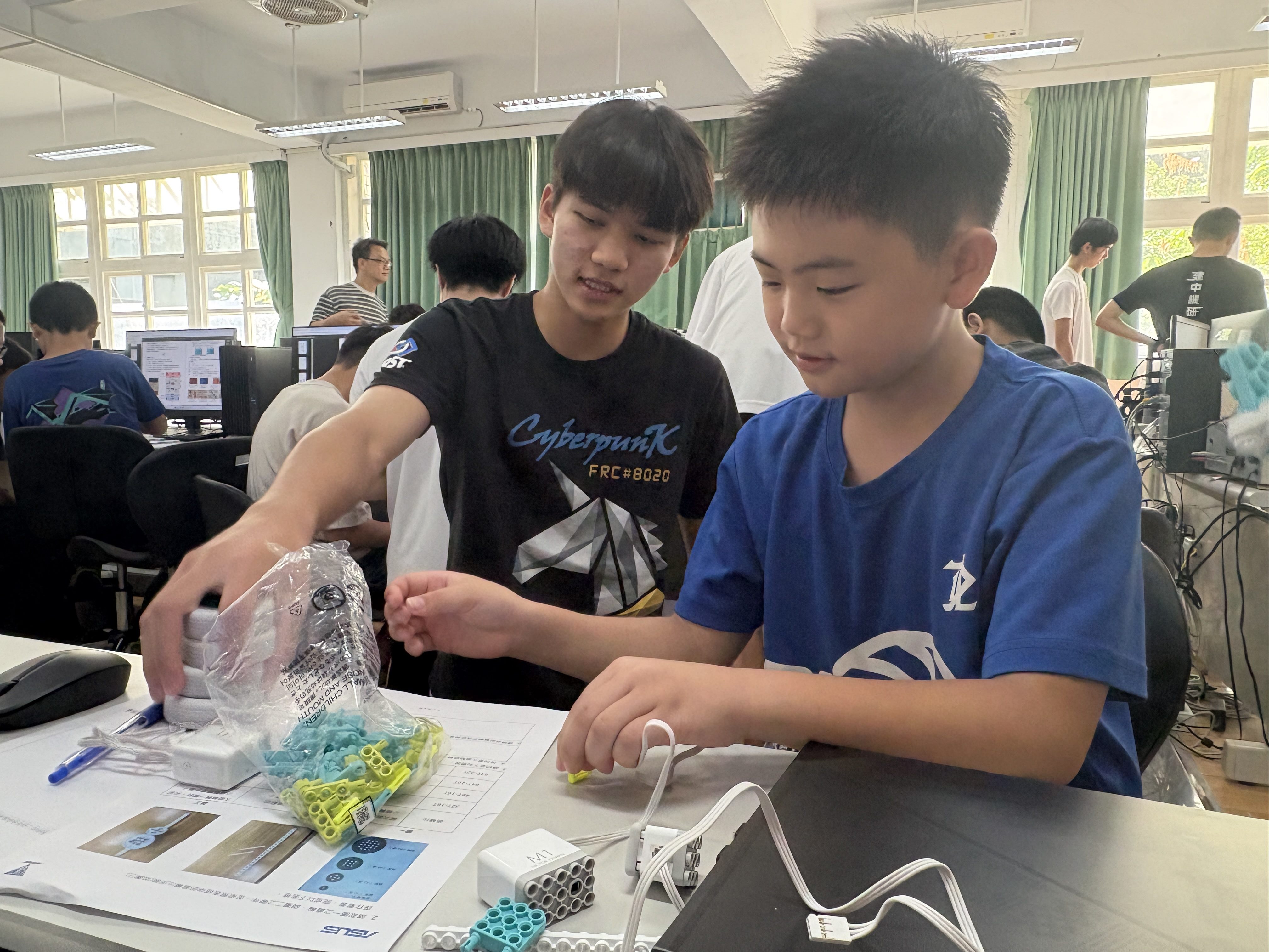 活動當天建中學生引導參加國中小學生進行小組合作,從基礎的程式邏輯到機構設計,逐步疊加,並藉由「攻城略地」任務競賽,學生必須運用齒輪傳動與發射結構,設計出能精準命中目標的機器人。來自成德國中許祐瑄及修德國小許芯瑀同學不約而同地提到,這個活動除了很有趣之外,也讓他們對機器人的了解以及程式碼的用法增加許多。