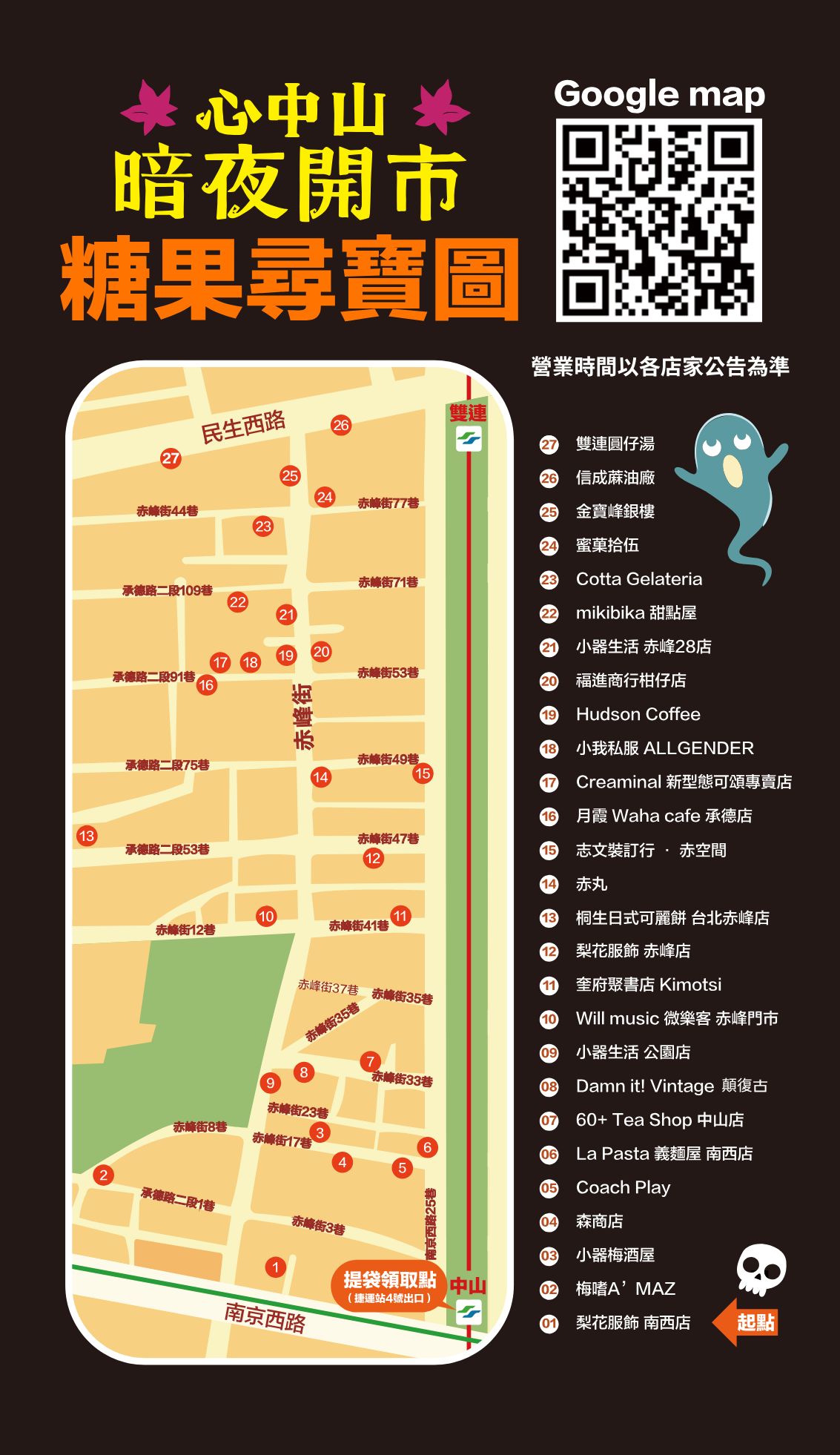 10月24日及25日兩天下午2時開始,12歲以下孩童穿戴萬聖節元素,前往捷運中山站4號出口旁的胖卡餐車處,秀出裝扮就可領取免費的南瓜提桶(每日限量150名),還可至赤峰商圈指定的合作店家,領取店家精心準備的糖果;臺北捷運公司超人氣IP捷米,於10月25日下午2時及3時,現身發送紀念幣與大家同樂!