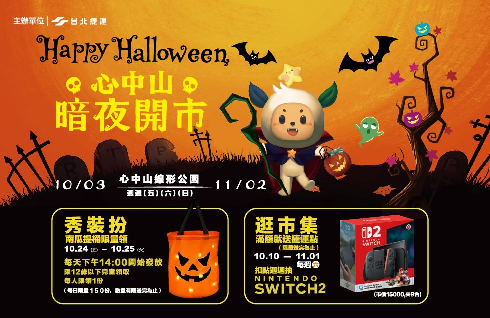 Happy Halloween!從臺北市兒童新樂園的「萬聖變裝點心趴」,到心中山線形公園的「暗夜開市」,萬聖節主題系列活動熱鬧登場,邀請大家一起放膽搞怪、歡度萬聖節!