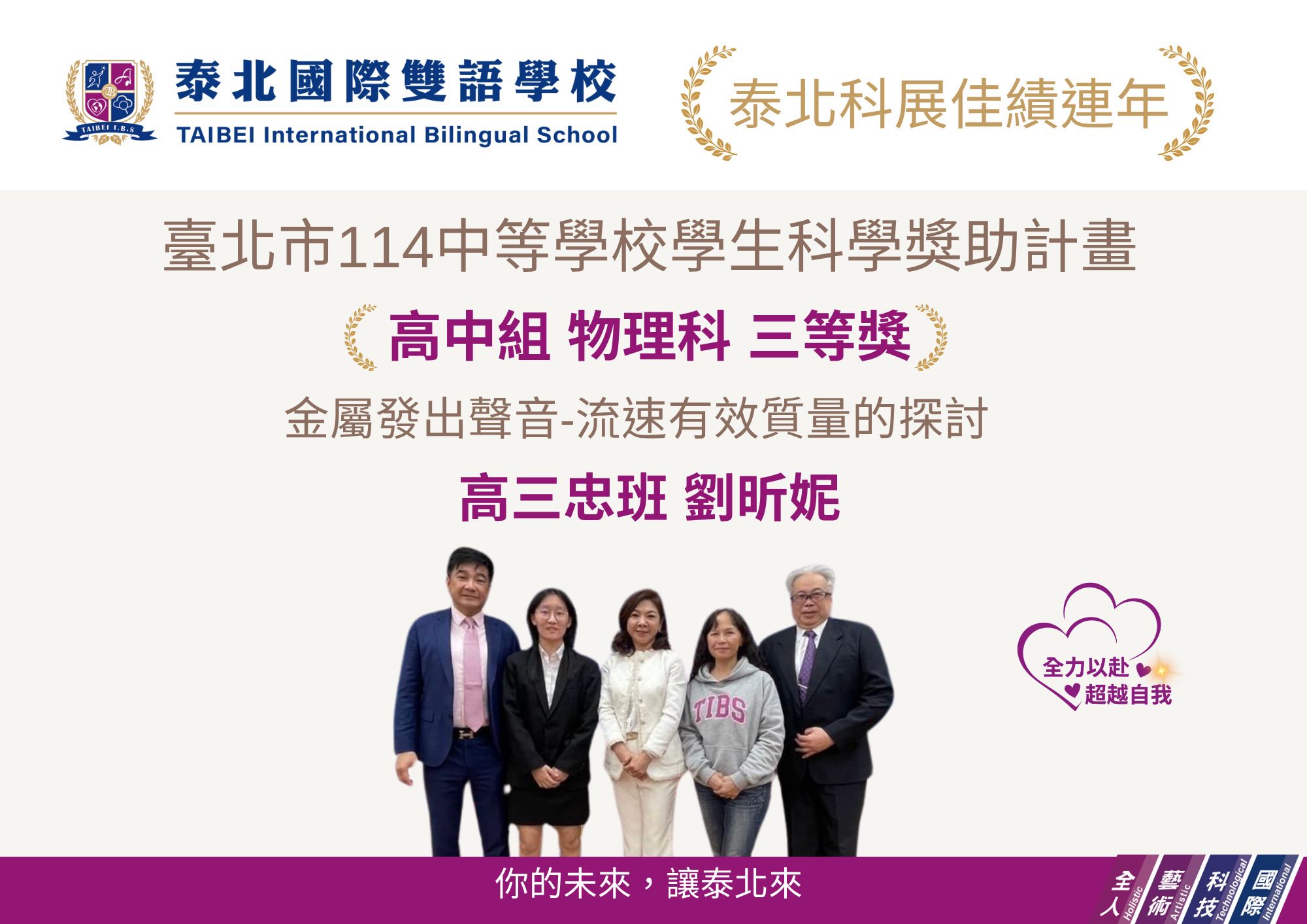 董事長楊奕蘭也表示,科學研究是鍛鍊思維與創造力的最佳途徑,同時也是科技發展的基石,泰北將持續提供支持學生研究的環境,鼓勵師生共同精進。泰北國際雙語學校以「全人、藝術、科技、國際」為核心教育理念,鼓勵學生跨域探索、勇於創新。本次獲獎成果不僅是學術研究的肯定,更是多元培育人才的成果,落實學校願景「成就孩子,無限可能」。