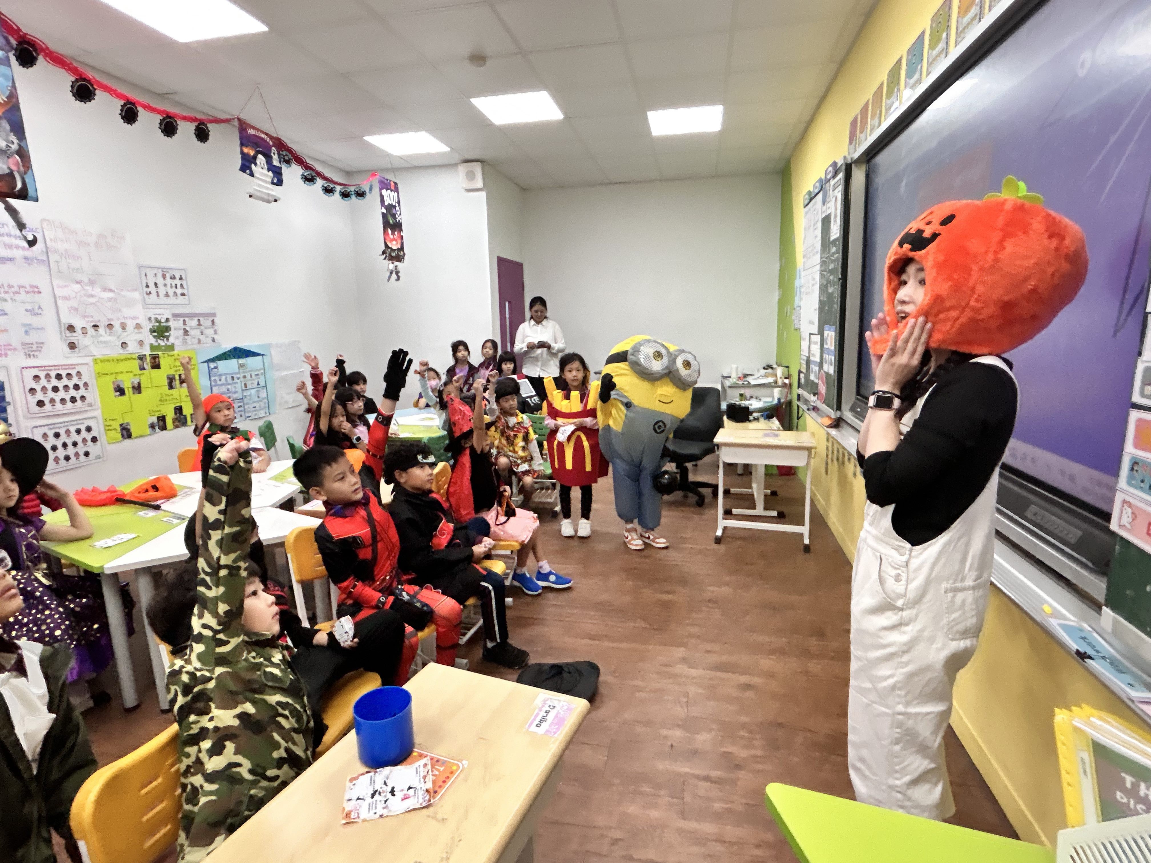 今年活動更結合科技元素,「記憶力大考驗」與「尋找Halloween」透過螢幕互動、影像辨識與英語配對,讓學習不再只是紙本活動,而是科技融入生活的實踐。孩子們一邊觀察螢幕提示,一邊用英語回答問題,從遊戲中訓練反應力與語言表達,真正做到「玩中學、學中樂」。