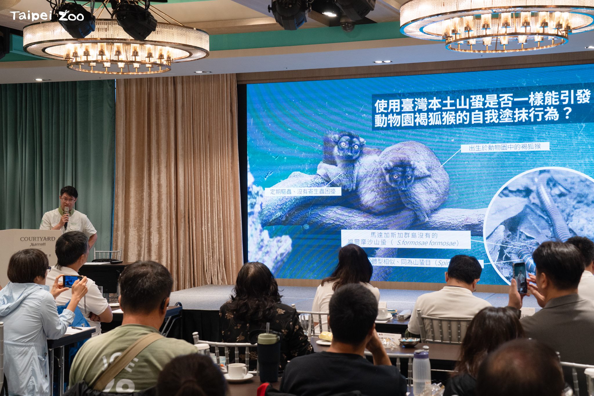 臺北市立動物園今(2025)年獲得第一名獎項的「狐猴塗抹替代物」是兒童動物區的保育員詹祐翔回顧研究文獻得知美狐猴屬(Eulemur)的動物有刺激山蛩(馬陸)利用其分泌物塗抹身體來預防疾病、促進社交的習性。經過測試後發現即便是在動物園內出生的褐狐猴,雖然沒有接觸過原棲地產的馬陸,也沒有學習過塗抹馬陸分泌物的方法,卻還是可以透過臺灣原生馬陸─福爾摩沙山蛩分泌物中的關鍵化合物「對苯醌」引發塗抹行為。因此保育員先設計了以回收枝條和麻繩構成的巨大「馬陸造型」並插上附著馬陸分泌物的樹枝,褐狐猴拿到這些手感和馬陸很像的樹枝後,會利用上面的化學物質塗抹在尾巴和陰部,並為其他褐狐猴塗抹、理毛展現群體間的正向社交互動,減少衝突並增加行為多樣性,而這塗抹的社交過程,像極了人們相互協助噴防蚊液或使用乳液、體香劑的概念。