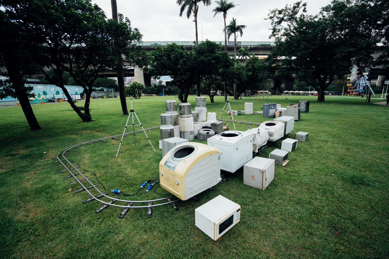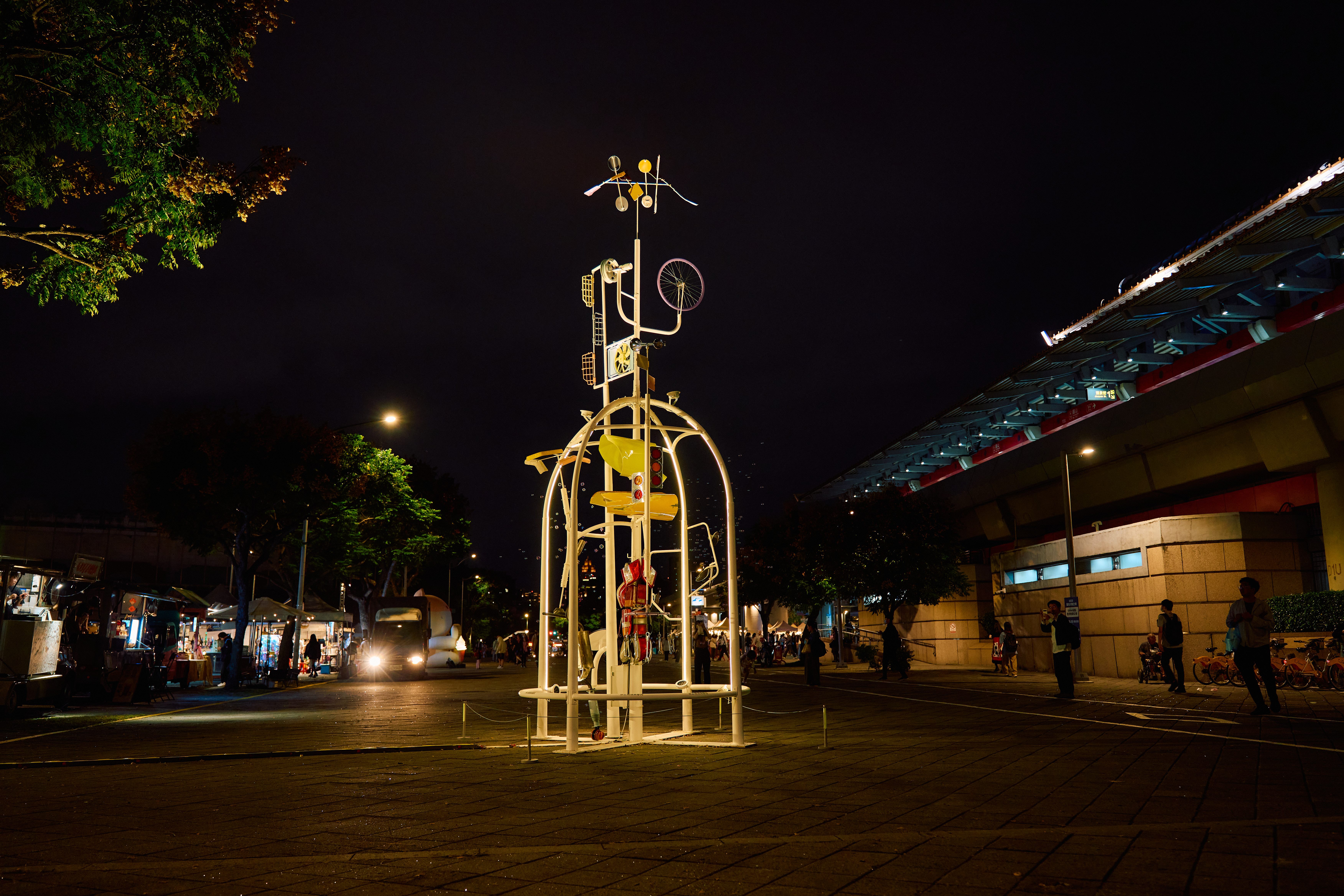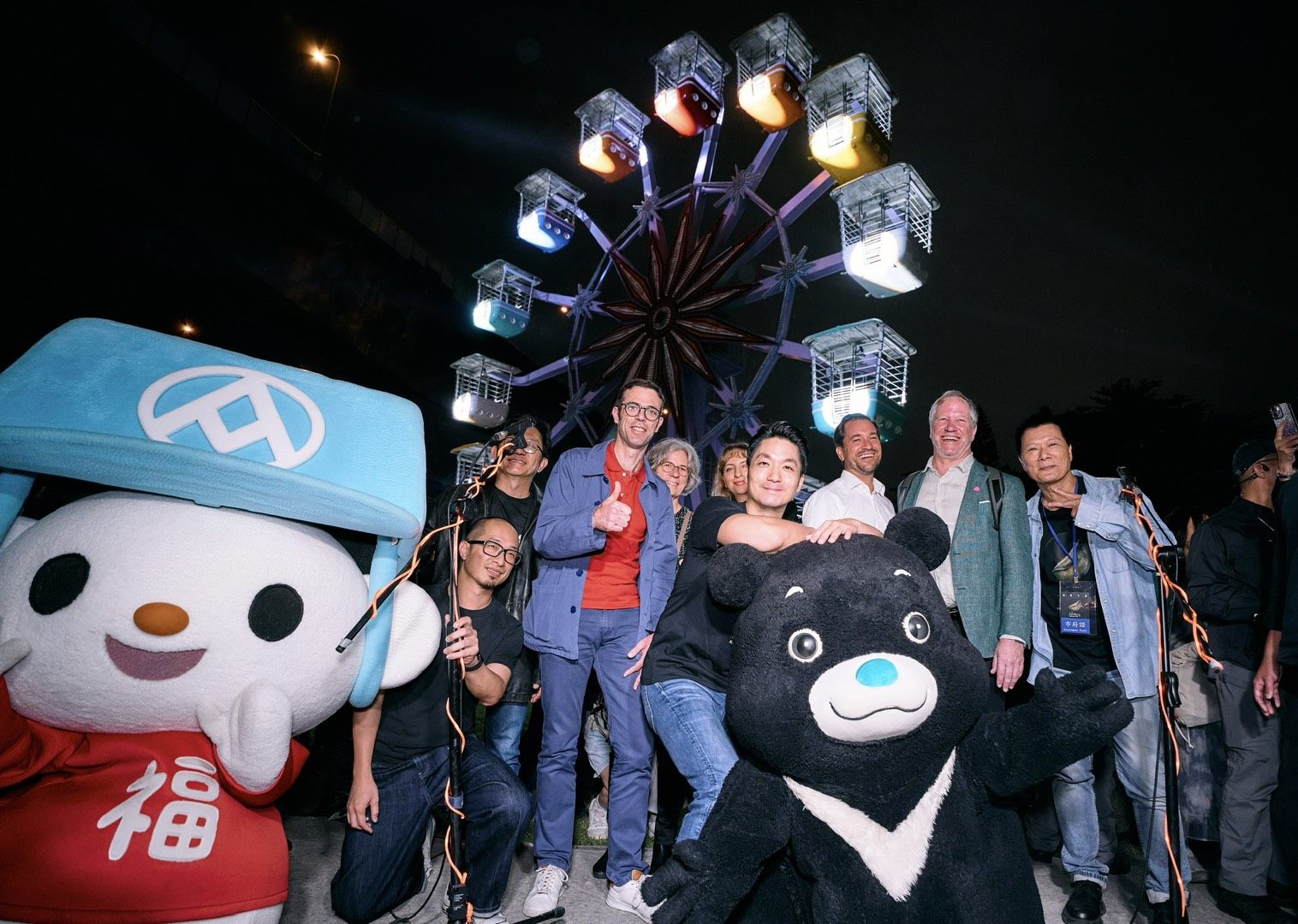 儀式結束後,蔣萬安市長與貴賓們在藝術總監黃彥穎導覽下,陸續參訪多項臺灣藝術家的白晝之夜作品。一行人首先欣賞藝術家江忠倫與林建志的作品《黑夢—狛犬》,緊接著來到了今年最大亮點之一,為藝術家姚仲涵創作的大型聲光裝置《光電獸#45-請支援收音》,此作品由全聯福利中心獨家贊助,邀請民眾以聲音點亮摩天輪,那熟悉迴盪於全聯門市的音樂與日常聲響,被轉化為流動的光與節奏,為城市的夜揭開閃耀的序幕,現場氣氛熱烈。此時,「熊讚Bravo」與本次熱情贊助的全聯福利中心吉祥物「福利熊」驚喜現身,掀起全場歡呼,許多民眾紛紛拿起手機合影留念,迎來全場最高潮階段!隨後依序參觀了藝術家蔡文章與賴彥均《一首歌掉在了地上》作品。