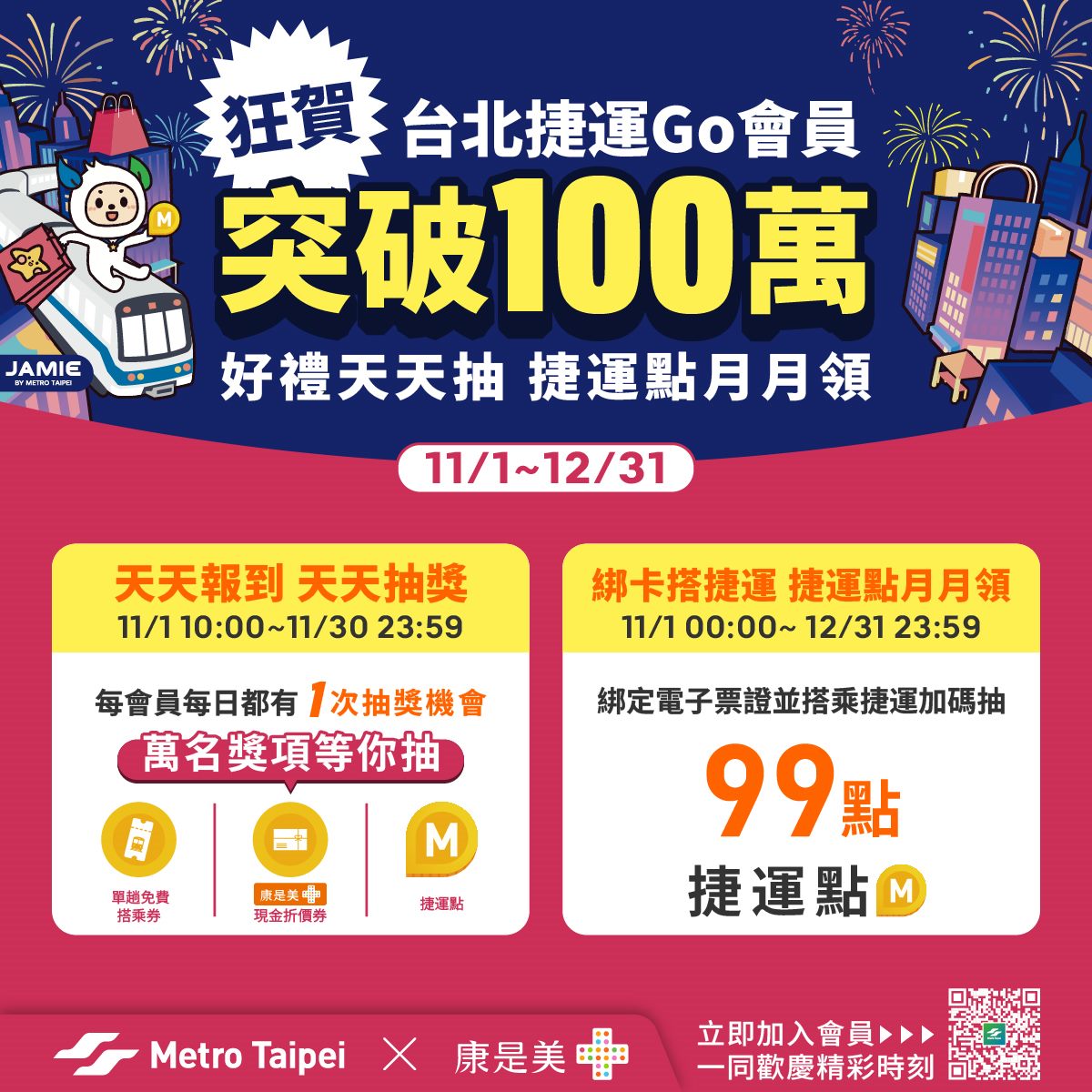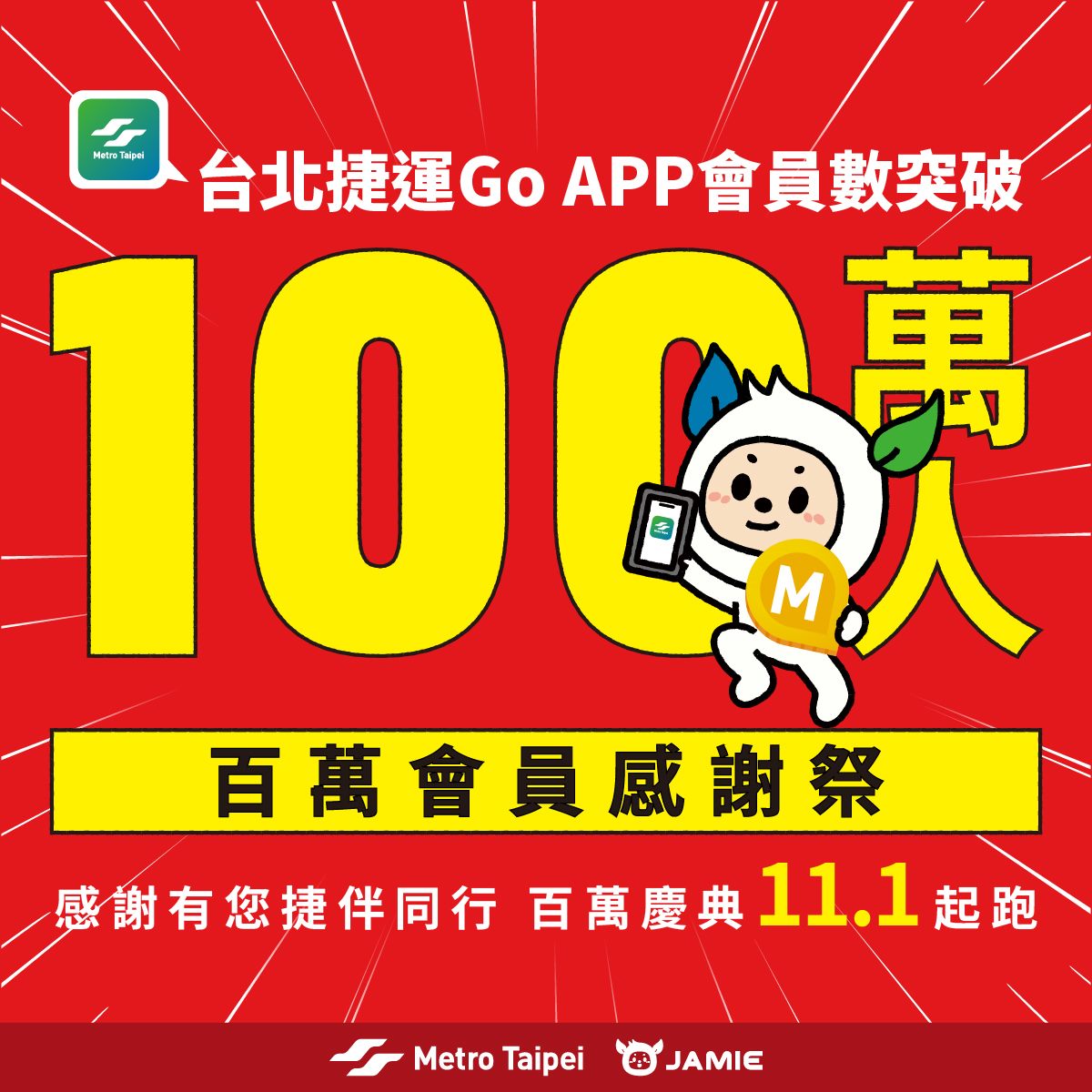 慶祝「台北捷運Go」App會員突破百萬人次,臺北捷運推出超值點數回饋活動,歡迎大家加入百萬會員行列,天天抽獎試手氣、月月搭車領點數,輕鬆累積捷運點。