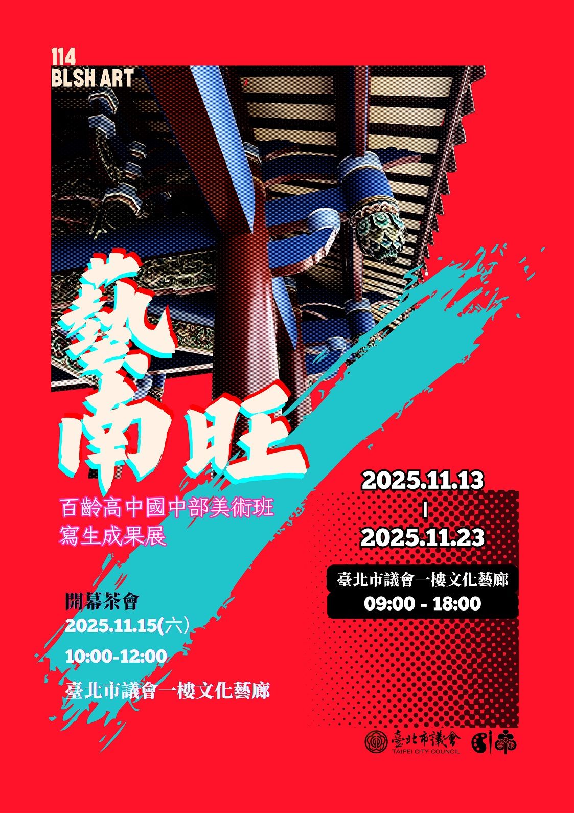 百齡藝廊及藝文櫥窗展出時間為114年11月1日(五)至11月10日(一)、臺北市議會-文化藝廊展出時間為114年11月13日(四)至11月23日(日)及開幕茶會為114年11月15日(六)上午10點舉辦