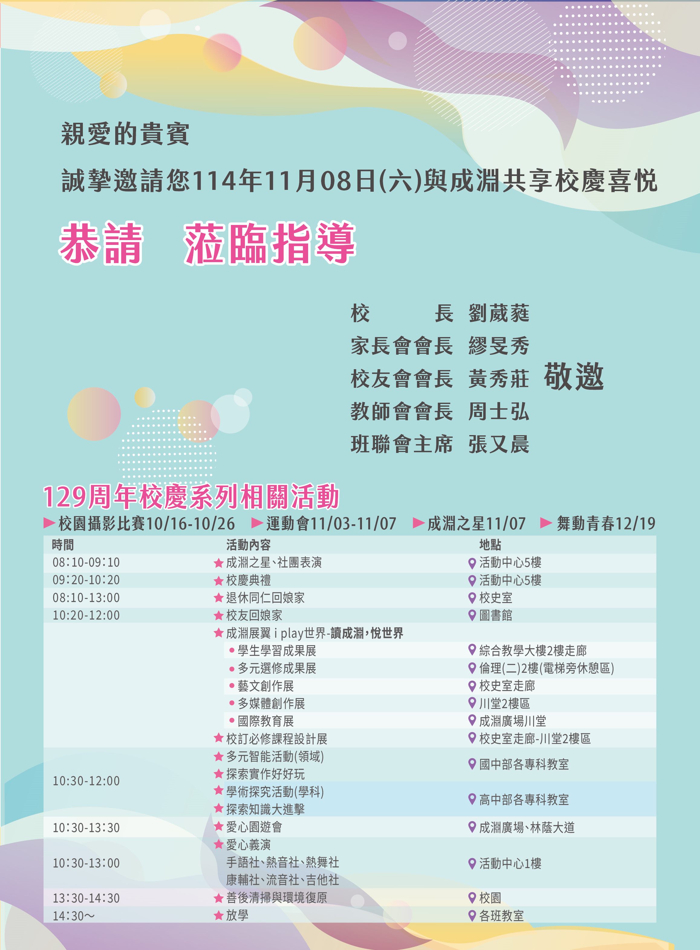 成淵高中創校129周年,秉持優質、創意、適性的學校願景,培育學生主動探索、展現合作、自信表達及社會關懷的素養,發揚自發、互動、共好的精神,立足臺灣,放眼國際,本校將以堅實的教育根基與創新能量,穩健邁向130周年的嶄新里程碑。