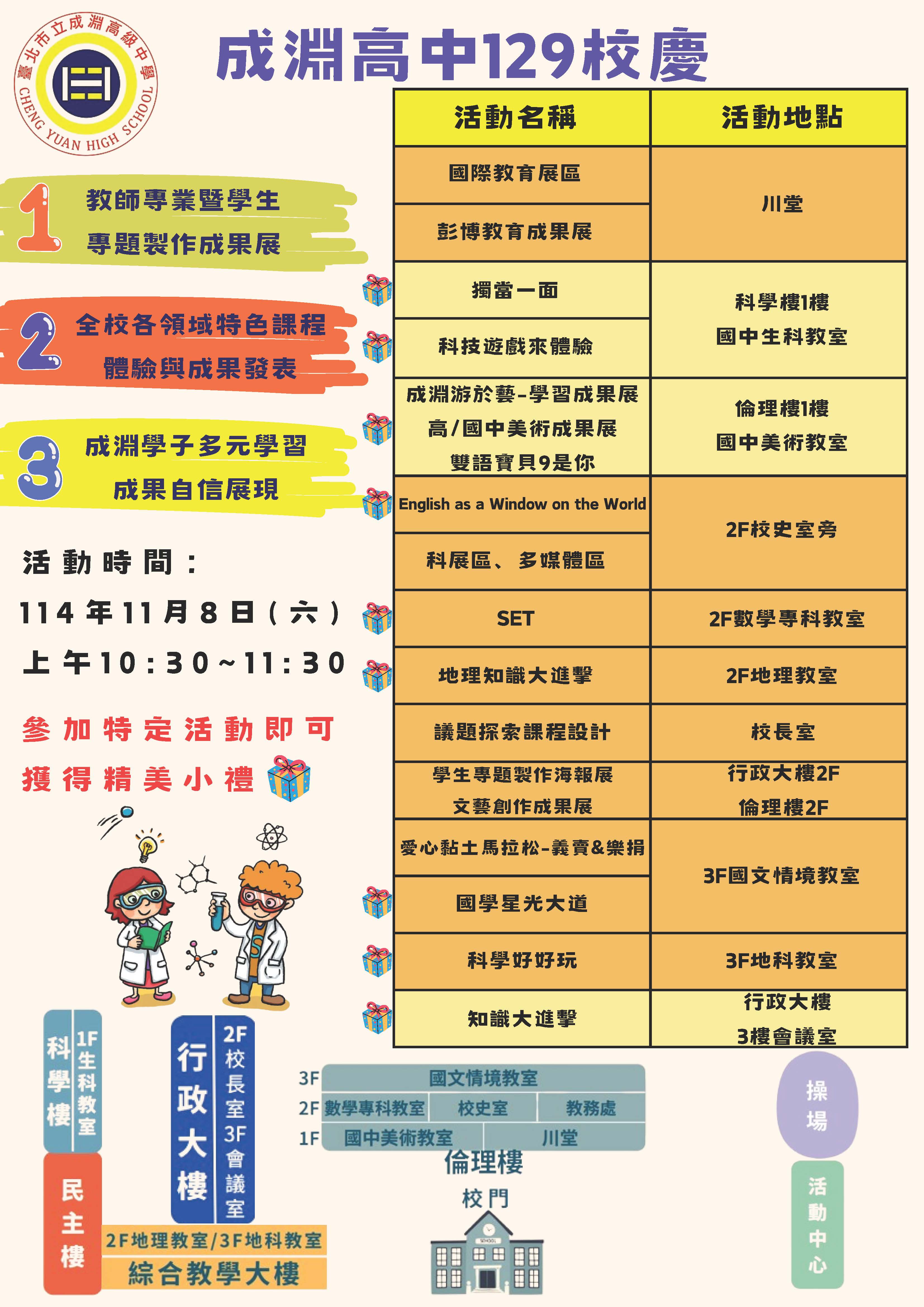 129周年校慶大會當日,除了由「成淵之星」歌唱、舞蹈及才藝各組冠亞軍同學帶來動感演出,並由社聯會27位社長攜手合作的舞蹈表演,充分展現了成淵學生的熱情活力。本屆校慶愛心園遊會於成淵廣場與林蔭大道登場,攤位由各班精心策劃與設計,從香氣四溢的小吃、沁人心脾的飲品,到趣味十足的遊戲,應有盡有。誠摯邀請您一同參與,共享本次校慶的喜悅!