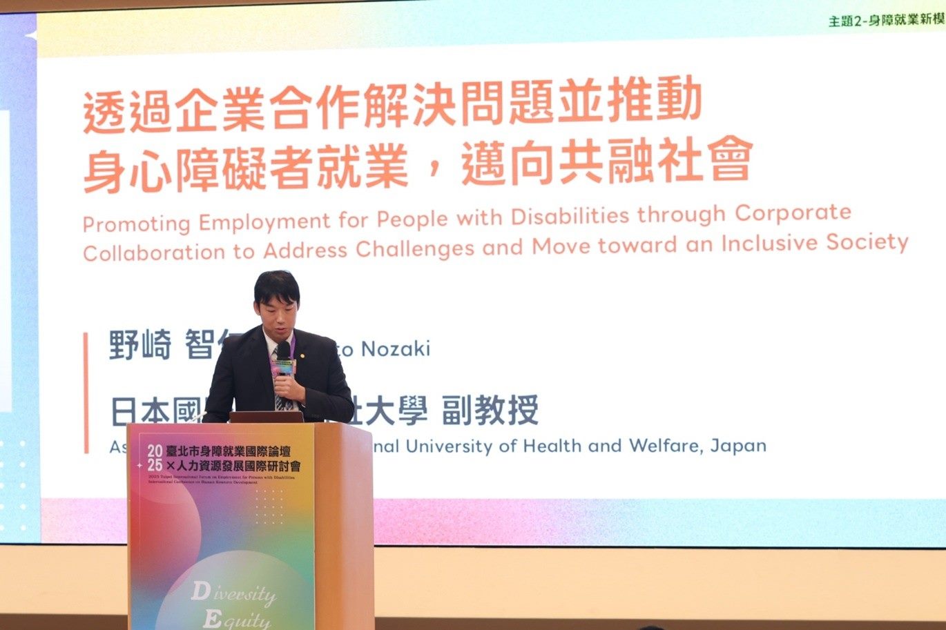 在「身障就業新模式」的實踐與創新的主題中,日本國際醫療福祉大學野崎智仁副教授介紹,NPO與企業協作推動地方共融的案例,提供身心障礙者安心工作環境,且進入社區共同發展,展現社會創新的力量。若水國際陳潔如執行長與日本丹青社岡崎勝久統合部長分享跨國BIM數位職能合作計畫展現身障員工體現的非凡職能,示範科技與共融的完美結合。