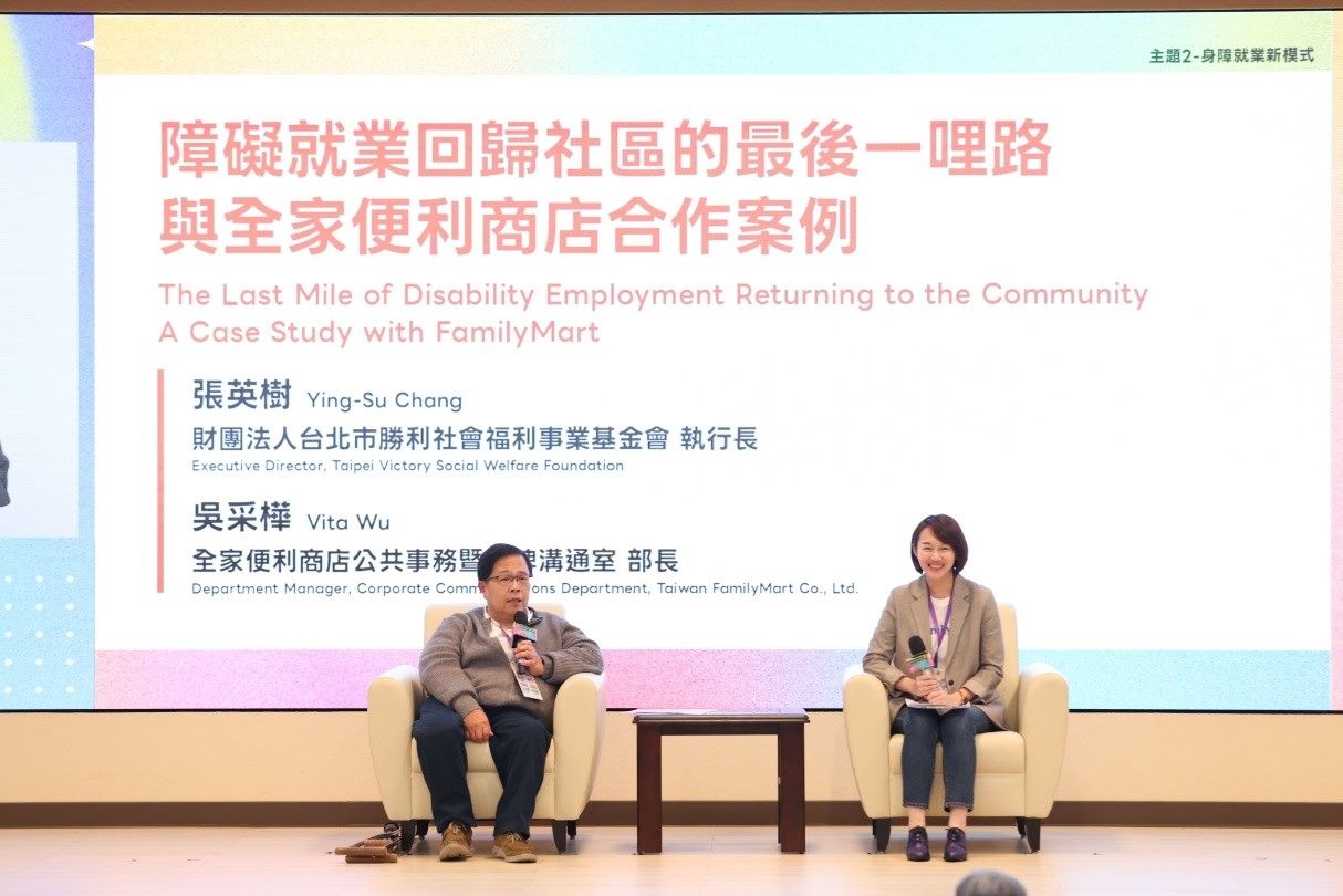喜憨兒基金會楊琇雁副執行長介紹與華碩合作的烘焙屋共融模式,實現企業、基金會與員工三贏局面。陽光基金會王顧婷站長與長沂國際沈君芳執行副總 展示「心加油模式」的全方位職能訓練系統,協助障礙者循序培養就業力,並拓展多元職涯。勝利基金會張英樹執行長與全家便利商店吳采樺部長共同介紹全台首創的身障團隊經營便利商店,超過400位身心障礙者成為便利商店的員工,並培養聽障員工取得加盟資格,成為社會共融的亮眼典範。