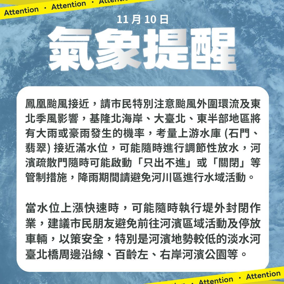 依氣象署預報,今(114)年第26號颱風「鳳凰」目前已通過呂宋島,正在南海重新整合,氣象署預估,今(10)日晚間發布海上颱風警報,明(11)日上午發布陸警機率最高,陸上警戒區域初估範圍包括中南部、花蓮、台東,北部將取決於颱風接近陸地時的減弱程度。請市民特別注意颱風外圍環流及東北季風影響,基隆北海岸、大臺北、東半部地區將有大雨或豪雨發生的機率,考量上游水庫(石門、翡翠)接近滿水位,可能隨時進行調節性放水,河濱疏散門隨時可能啟動「只出不進」或「關閉」等管制措施,降雨期間請勿再進入河川區進行水域活動。當水位上漲快速時,可能隨時執行堤外封閉作業,建議市民朋友避免前往河濱區域活動及停放車輛,以策安全,特別是河濱地勢較低的淡水河臺北橋周邊沿線、百齡左、右岸河濱公園等。