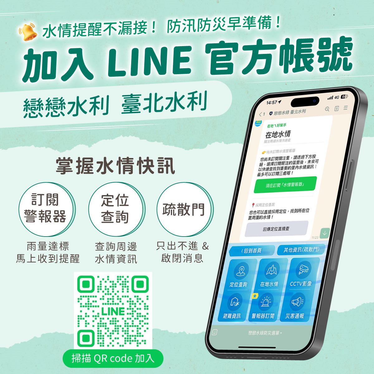 水利處也推薦市民打開LINE,將「戀戀水綠 臺北水利」加為好友 https://page.line.me/nyy4696t,這是水利處的LINE官方帳號,訂閱「水情警報器」功能,可接收雨量警戒,第一時間展開自主防災,還可提供雨量、河川水位、雨水下水道水位、抽水站狀態、淹水點查詢等功能,讓市民朋友快速獲得水情相關資訊。此外,也可下載本府「行動防災 APP https://goo.gl/hNz1Ef )」或「臺北市政府LINE官方帳號」(訂閱市政訊息/安全護照/水情訊息),主動了解降雨資訊。