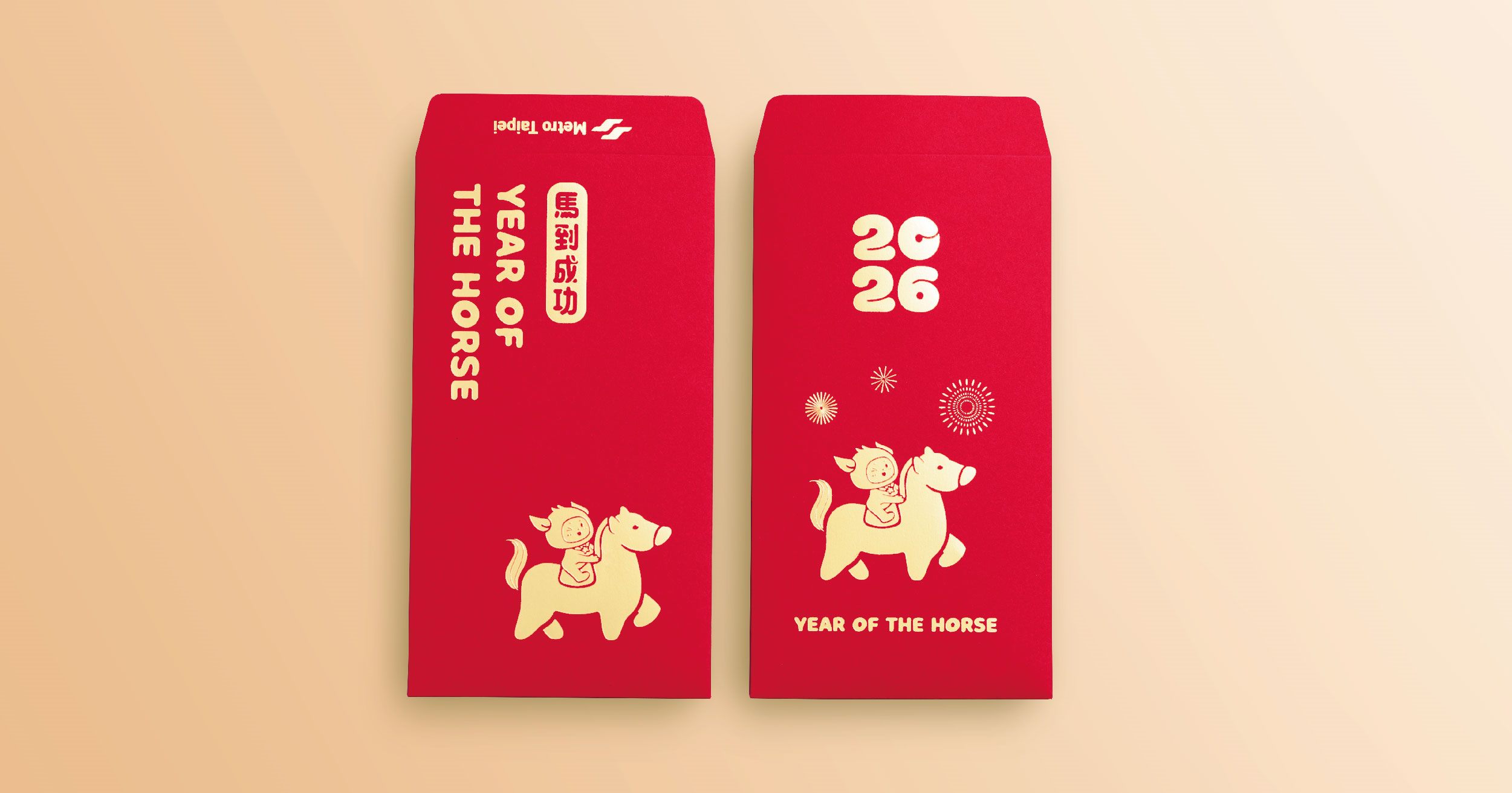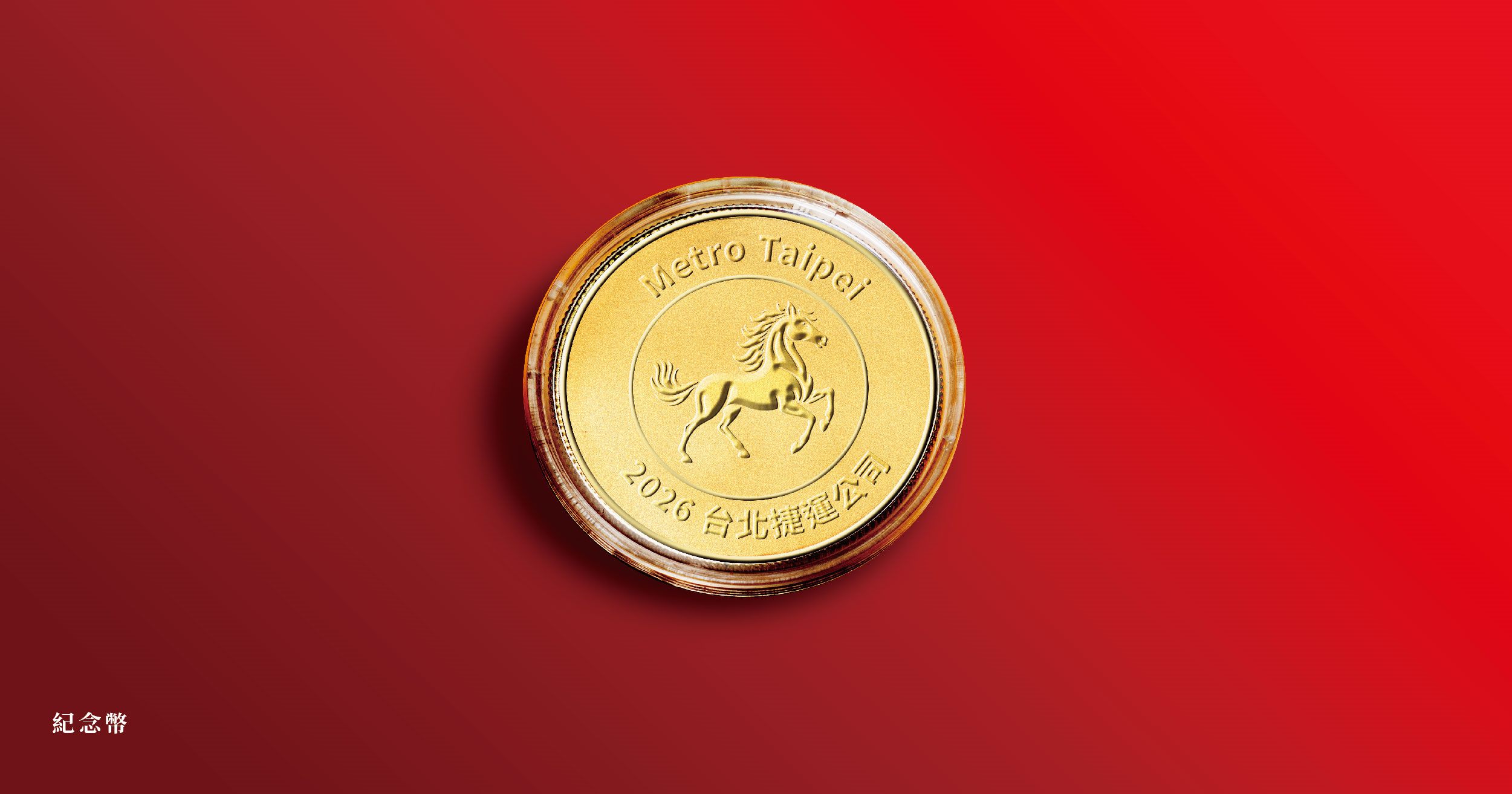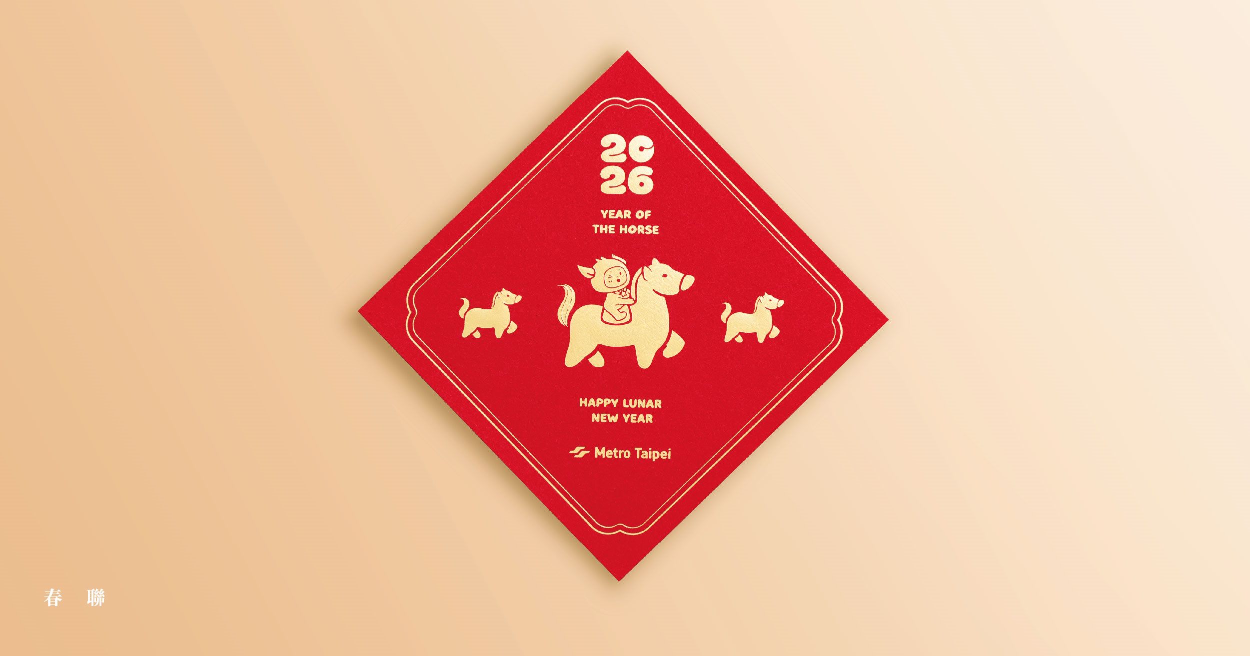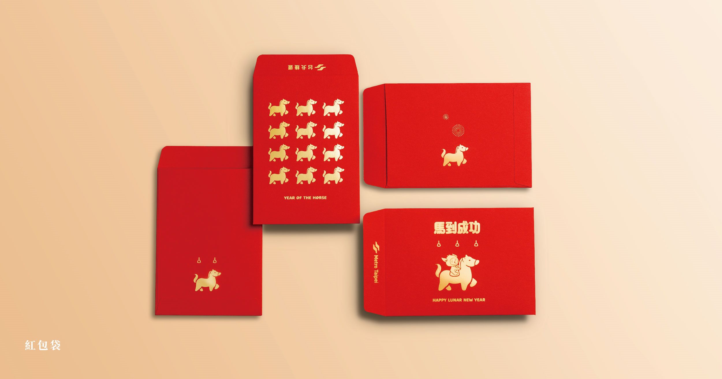 馬年紀念幣,鍍金金幣上的駿馬象徵勇往直前、馬到成功;臺北捷運一日票、春聯斗方與紅包袋則加入「捷米」元素,採用插畫風格將童趣融入其中,讓整體設計更有趣。