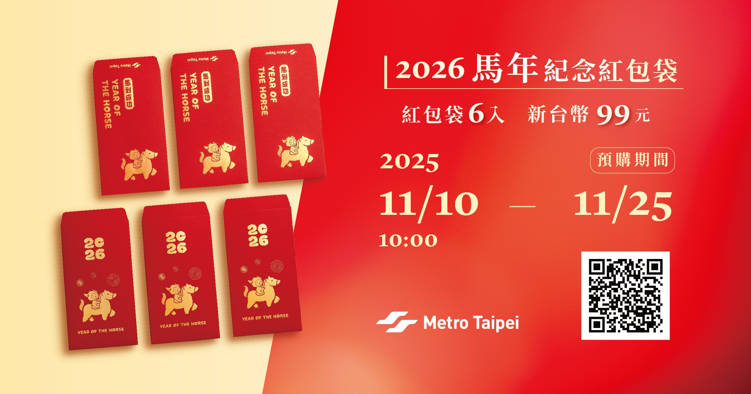 即日起至11月25日止,KKTIX平臺開放預購「馬年紀念套票」與「馬年紀念紅包袋組」,憑預購成功電子票券QR code,2026年2月2日至13日每日中午12時30分至晚間7時30分,可至臺北捷運商品館中山店(捷運中山站至爵士廣場間,近R10出口)兌換套票。