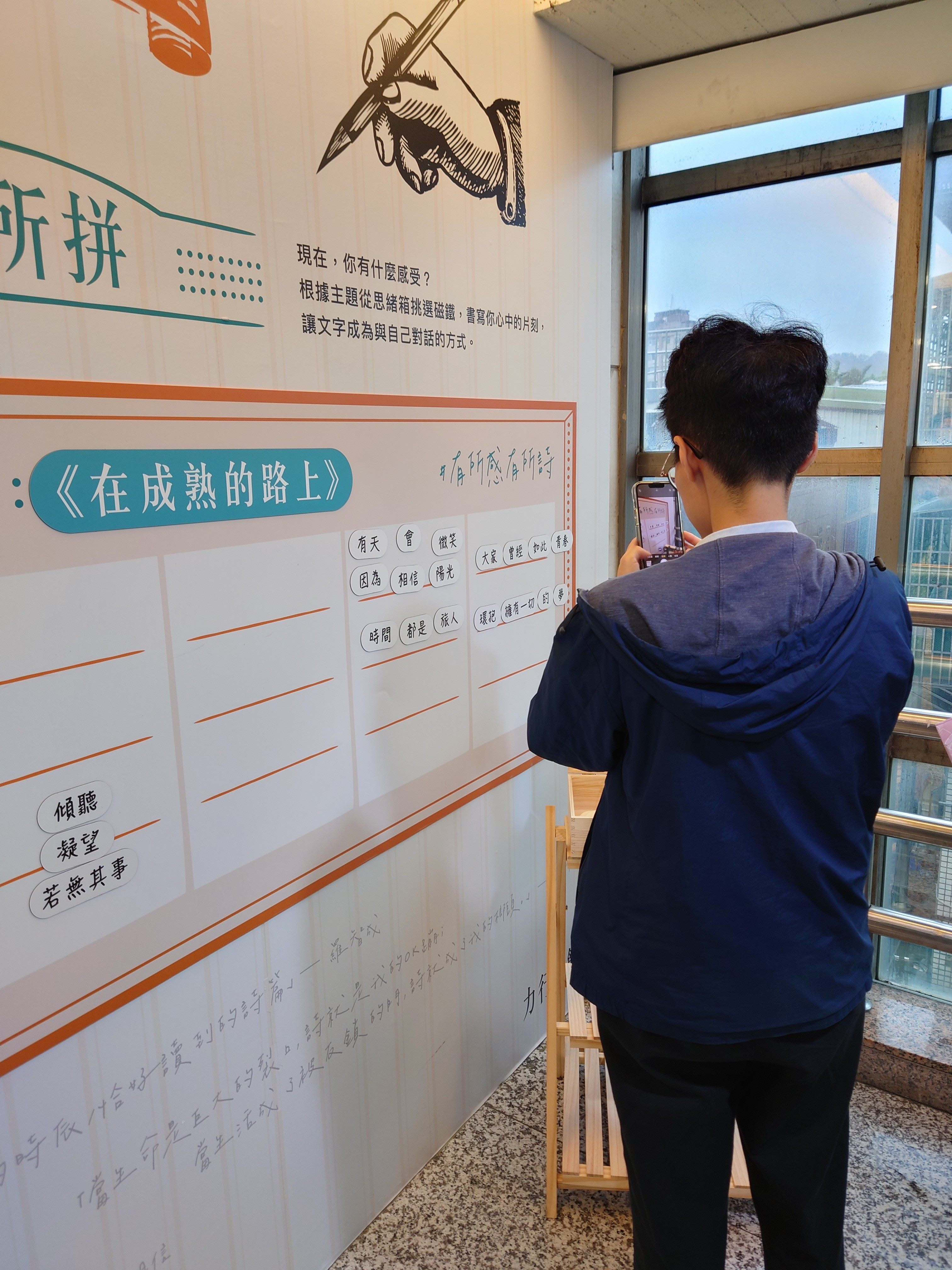 臺北市立圖書館力行分館主任表示,本次新設的5樓新詩互動牆共有兩個版面,「若有所拚」區有近40個單字,民眾可以自行在牆上排列組合,便能輕易拼出屬於自己的詩句;「如聞其聲」區則以翻翻板展示「我眼中的作家」及「詩文隨筆」兩大主題新詩作品,則是與景美女中青年社合作的成果,特別邀請了青年社社員們為力行分館創作了大量的展示作品。