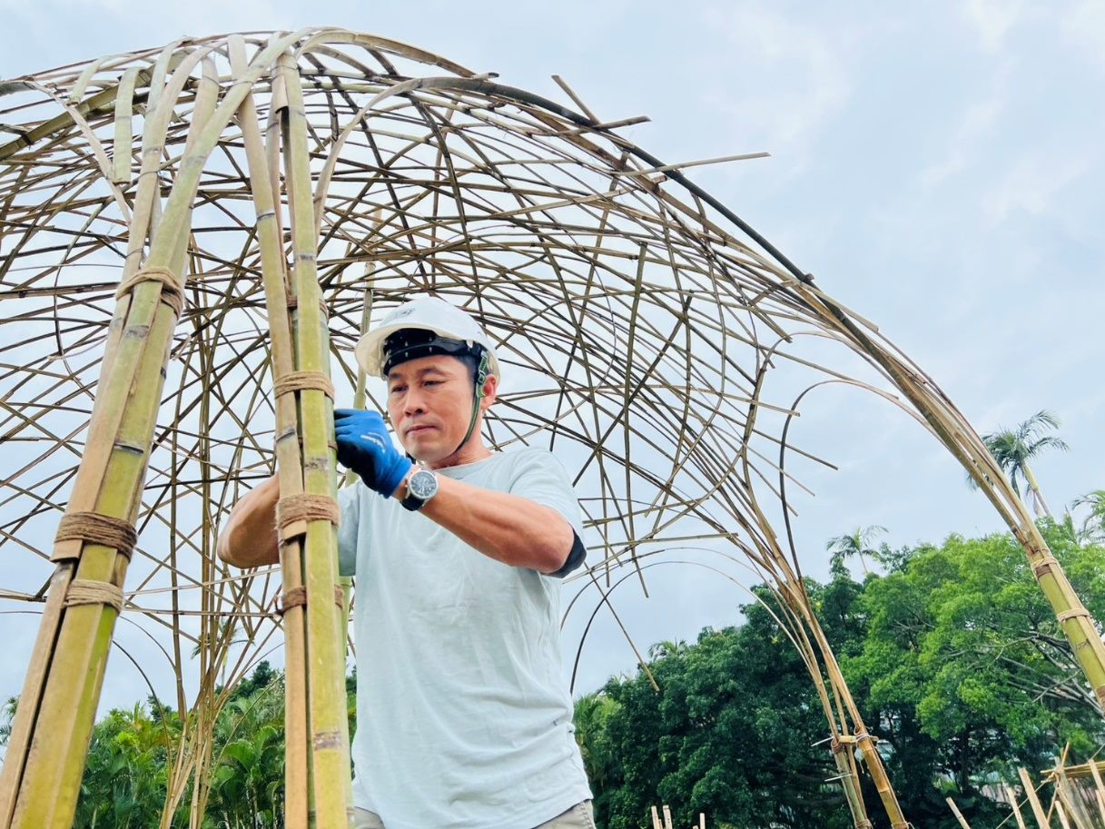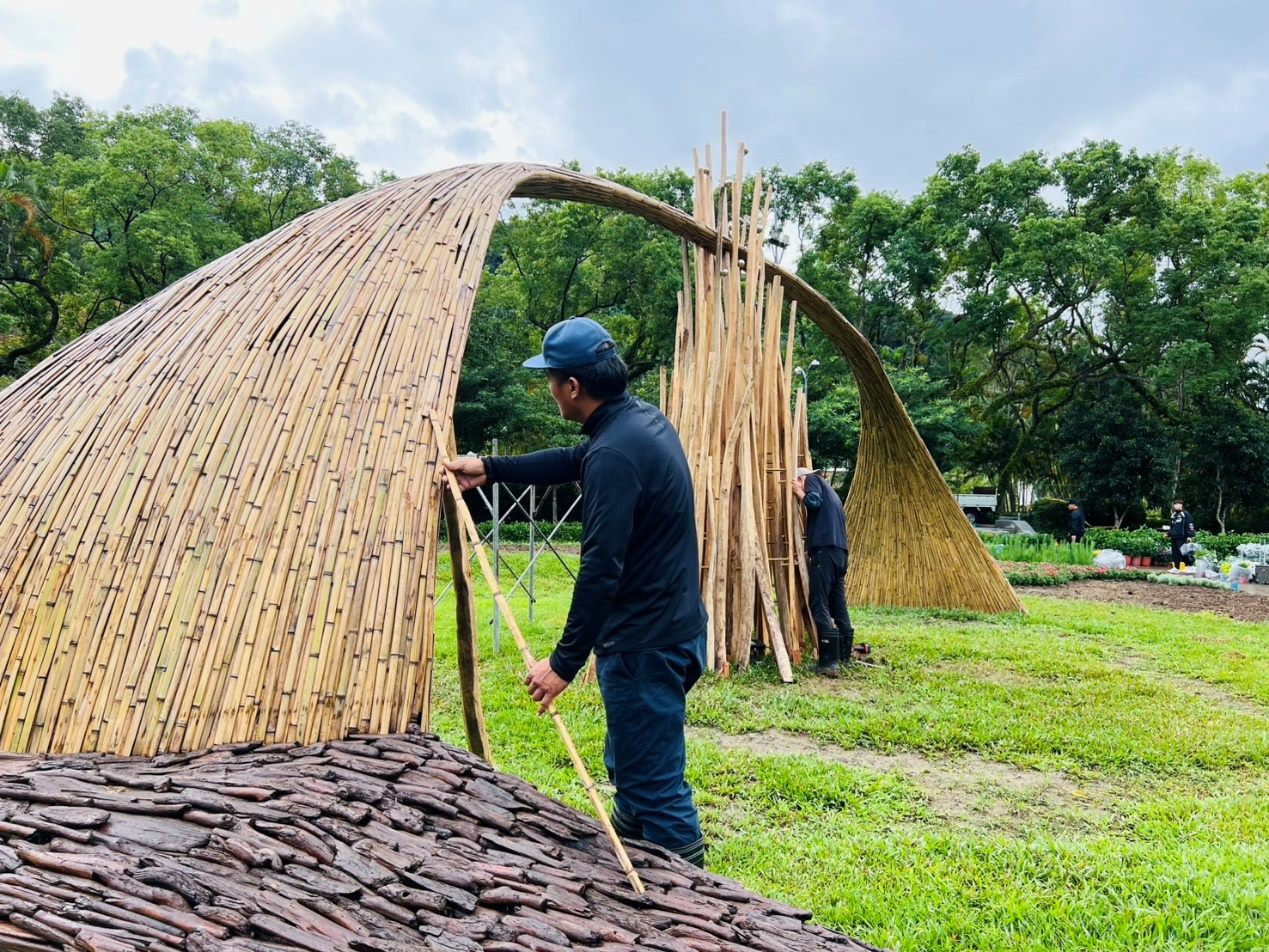 公園處藍舒凢處長表示,士林官邸菊展近年積極與各領域藝術家合作,創作出具識別度的特色作品。今年延續跨界精神,邀請多組藝術家共同打造大型裝置,以地景創作結合花卉展演,營造宛若置身畫境般的沉浸式體驗。在主題園區的「夢想逐路探尋」展區,花東地景藝術家撒部.噶照帶來大型新作「風起光湧」,以原木、竹材結合風的律動與光的穿透,打造會「發光、發聲」的地景藝術。作品更使用臺北風倒木再生創作,與花海如浪交織,呈現逐夢旅程的韌性與希望。在中式庭園「幸福.憩家園」展區與藝術家小亨利共同創作竹構裝置「流光之巢」,竹材交織成溫暖穹頂,陽光從縫隙灑落,如鳥巢般象徵「夢想的起點」,周邊藤球、斗笠與菊科草花營造恬靜氛圍,讓人沉浸在緩慢舒心的鄉野氣息。