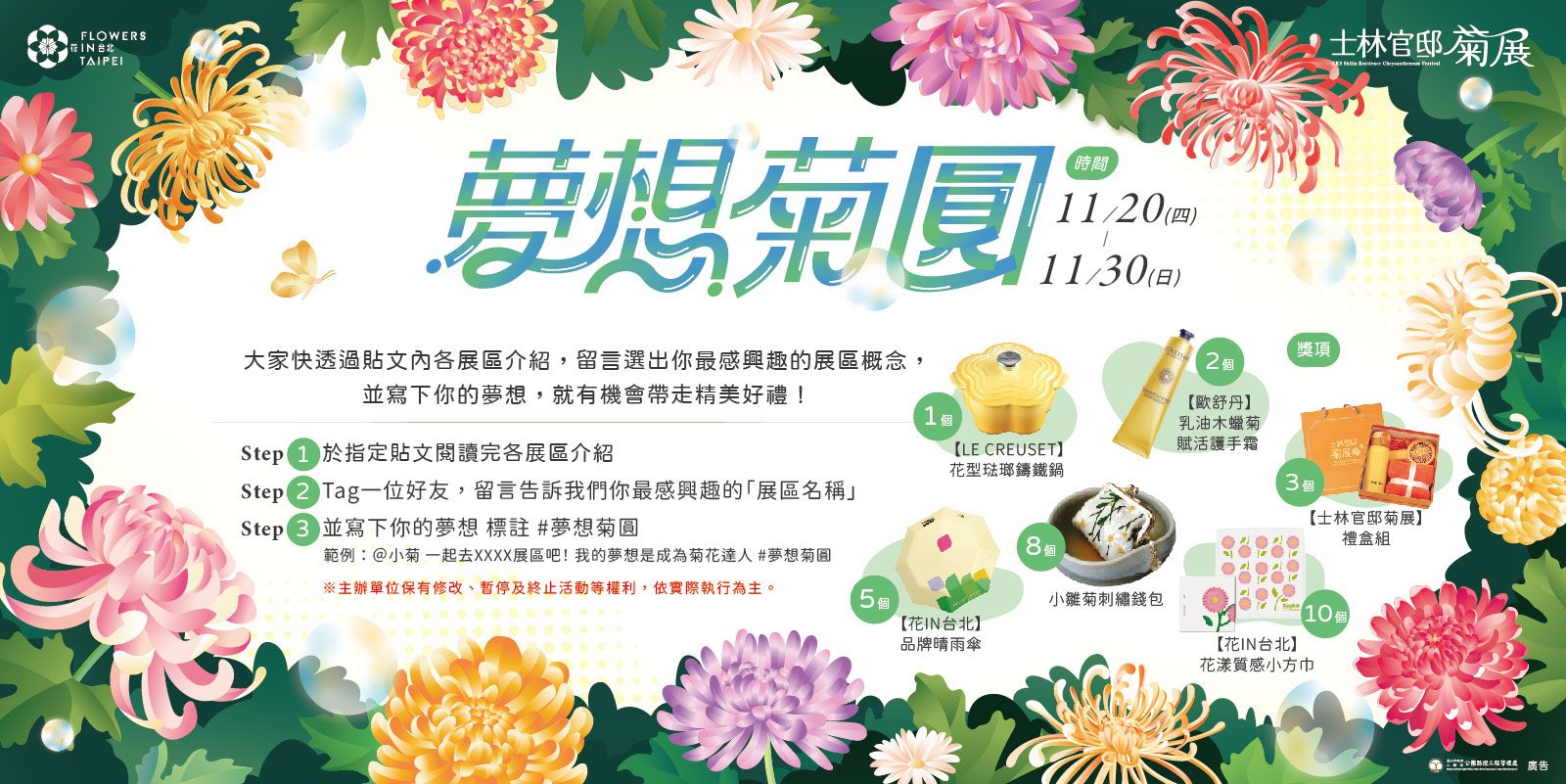 欲了解完整展區資訊,可至「花IN台北」官方網站查看詳細介紹與中英文語音導覽服務,深入感受每個展區的創作理念。同時,士林官邸旅客F B 於11/20-11/30將推出 「夢想菊圓」抽獎活動,您只要於指定貼文留言並 @朋友、票選你最喜愛的展區,即有機會獲得 LE CREUSET 花型琺瑯鑄鐵鍋、歐舒丹乳油木蠟菊護手霜等精美好禮,歡迎大家一起來參加拿好禮!