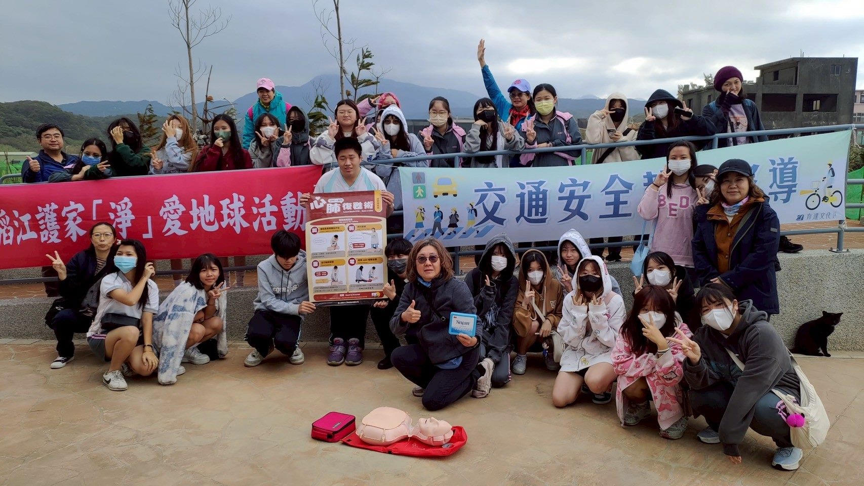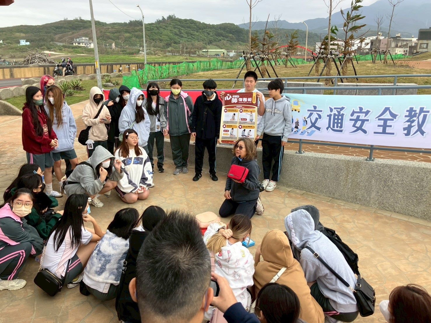 活動首先由張靖漪主任講授急救技巧,示範心肺復甦術(CPR)與自動體外心臟去顫器(AED)操作,強化學生面對緊急狀況的應變能力。接著,陳忠傑組長以實際案例說明交通意外常見型態與防範要領,提升同學交通安全意識;鄧文鈞組長則進一步指導乘車安全與防災演練,培養學生臨危不亂、冷靜應對的素養。