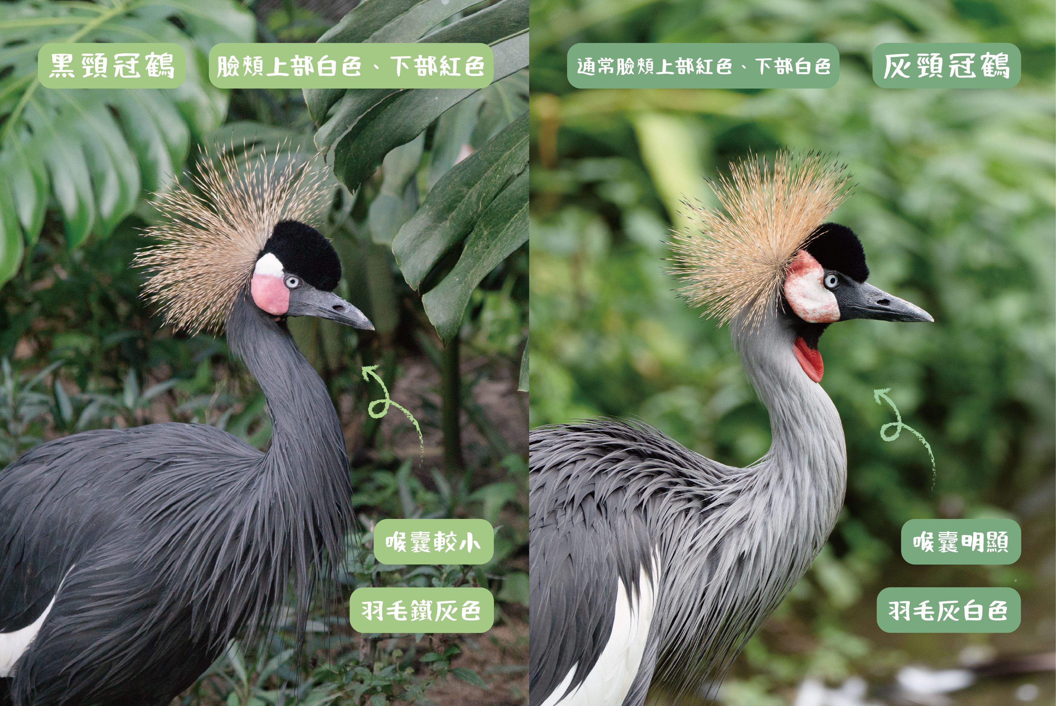 「鶴園」區其實還有另一對黑頸冠鶴在今(2025)年9月初孵出了一隻寶寶,最近也正換下咖啡色絨毛,長出灰色的羽毛,逐漸抽高變得身形修長,不過較晚出生的小黑頸冠鶴在體型上還是顯得相對小巧,有時會躲在植栽裡不容易發現。歡迎到鳥園輕聲細語賞鳥,放輕動作、保持安靜,避免驚擾到動物們,就有機會觀察到兩種冠鶴不同的成長階段!