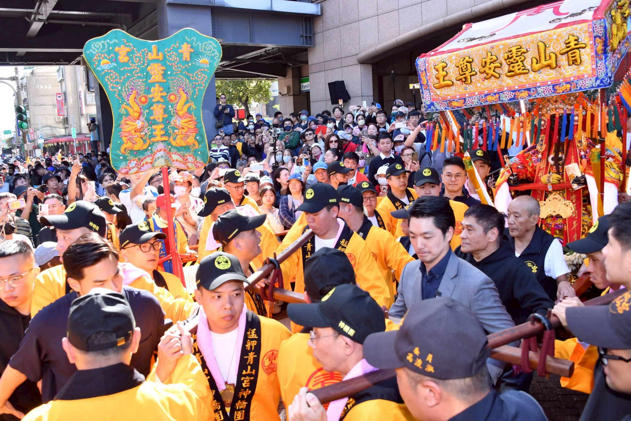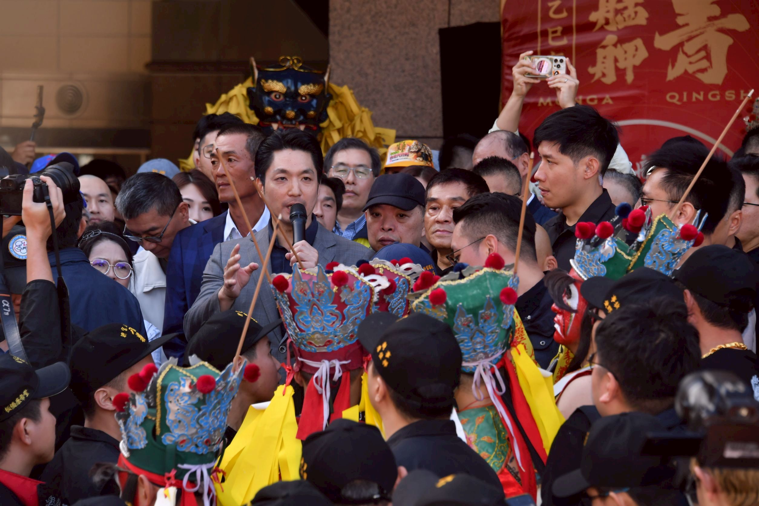 臺北市長蔣萬安今(29)日出席「2025青山王祭北港媽北上贊境」活動,與青山宮主委黃清源及眾多信眾一同恭迎自雲林北港朝天宮搭乘專車北上、駕臨艋舺的媽祖。