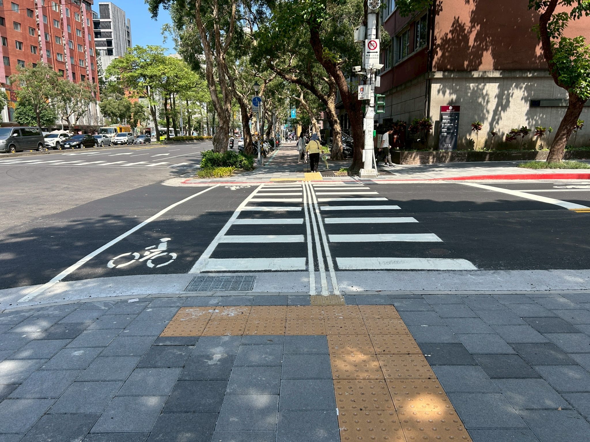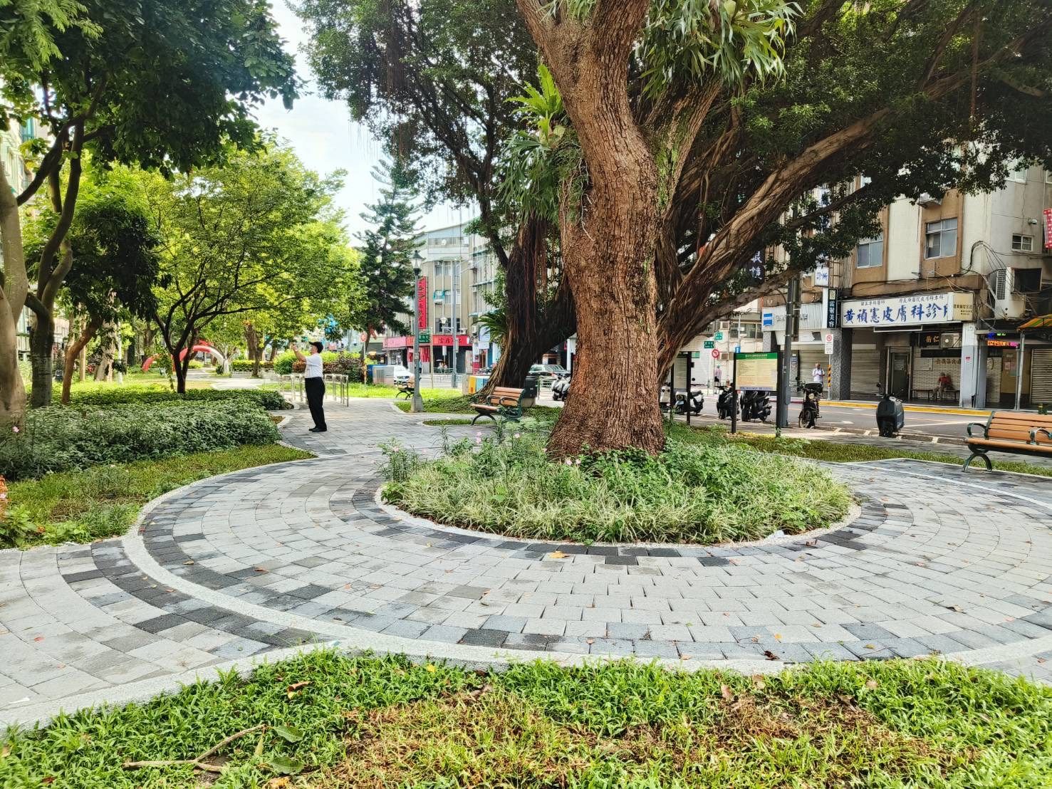 新工處共管科科長竺宣同說明,師大路涵蓋師大商圈及師大校本部範圍,無論平、假日往來人潮都非常多,改善前沿線既有人行道寬度僅約1.1至1.3公尺,且設有路燈、消防栓、號誌等設施還有車輛違停問題,沿線也都沒有無障礙設施,人行環境並不友善,本次改善重點將人行道進行島頭拓寬及設置景觀欄杆以及導盲設施,縮短行人穿越馬路距離,增加安全無障礙停等空間,也藉由既有設施的遷移、整併來提升人行通行淨寬,並於師大校本部東側門旁增設行穿線及行人號誌,以改善長期以來行人違規穿越馬路之問題,更考量整體通行環境一致性,將緊鄰師大路旁師大公園內老舊鬆動的步道鋪面一併更新,讓民眾除了安全的通行環境外,也擁有優質的休憩空間。