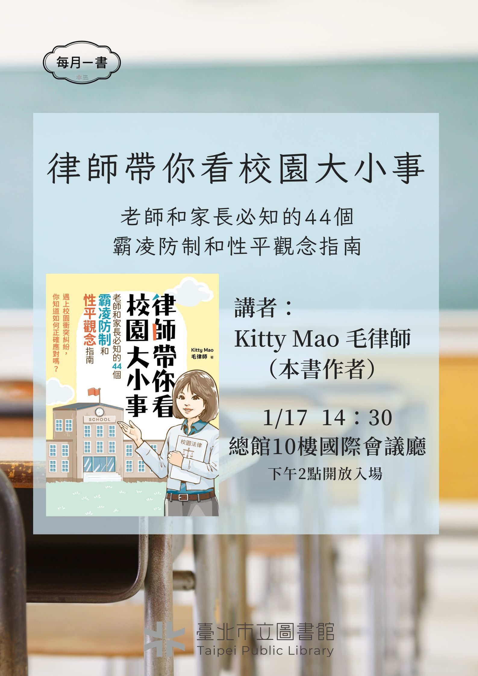 臺北市立圖書館1月份每月一書講座推薦圖書為《律師帶你看校園大小事:老師和家長必知的44個霸凌防制和性平觀念指南》,將邀請本書作者─Kitty Mao 毛律師在1月17日(星期六)於總館10樓會議廳進行導讀分享。