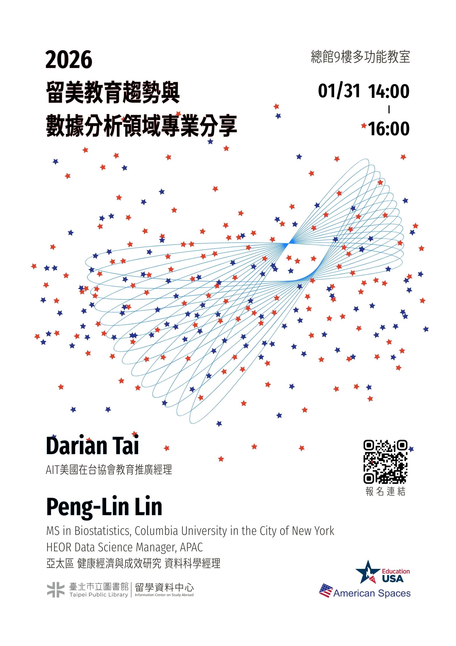 臺北市立圖書館留學資料中心於1月31日(六)下午2時邀請美國在台協會教育推廣經理Darian Tai與跨國醫療科技產業資料科學主管Peng-Lin Lin講師共同分享,結合美國留學趨勢解析與第一線產業實務觀點,協助有志赴美深造的學生與在職人士,理解留學美國的準備方向、學科選擇,以及留學決策與長期職涯發展之間的連結。