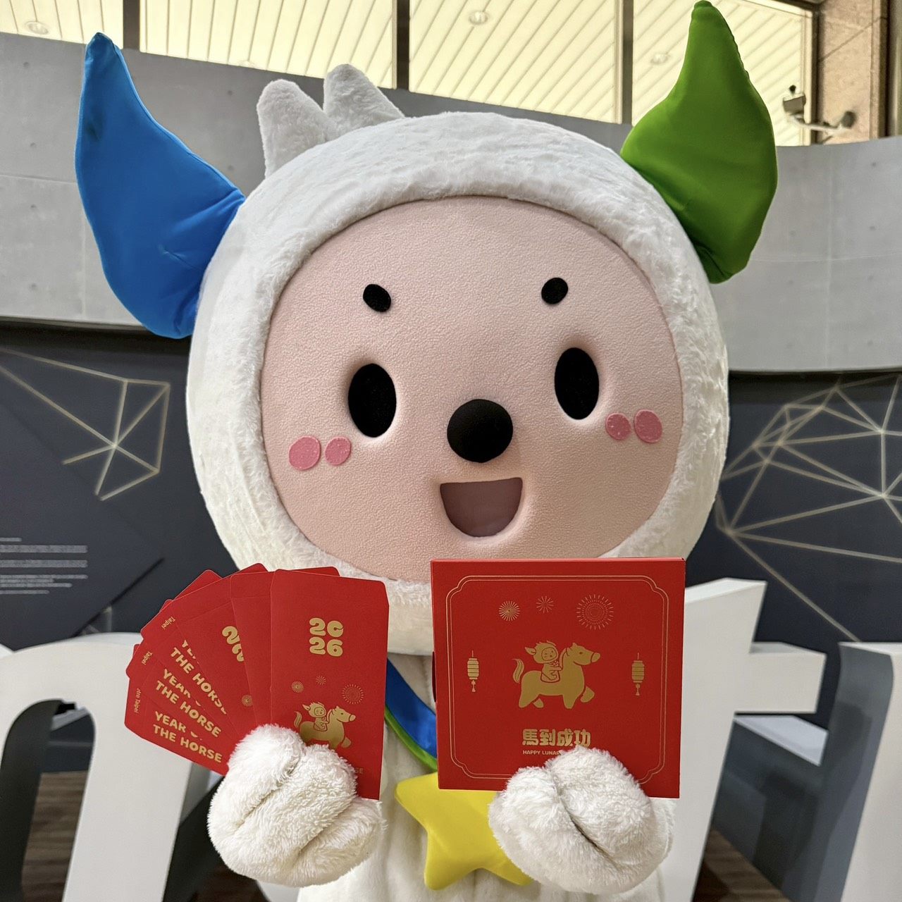 紀念套票與紅包袋以喜慶的正紅色為基底,點綴象徵財富與好運的金色燙金,北捷吉祥物「捷米」騎乘駿馬奔馳於票卡及紅包袋,展現新年大步邁向吉兆、步步高升的寓意。